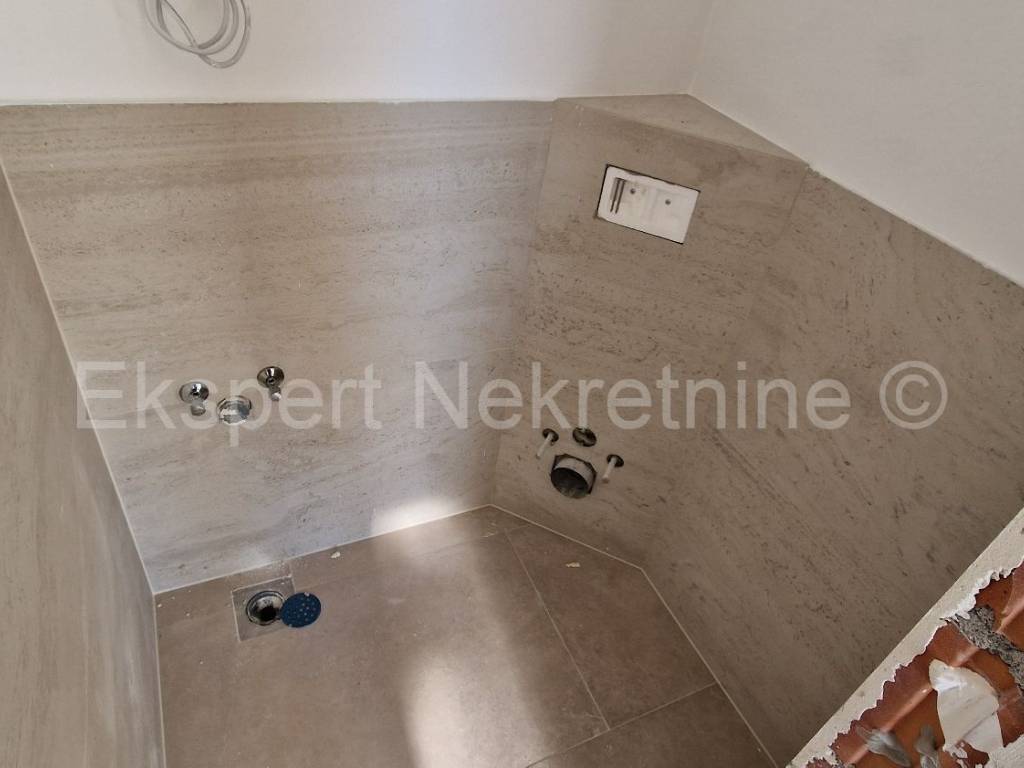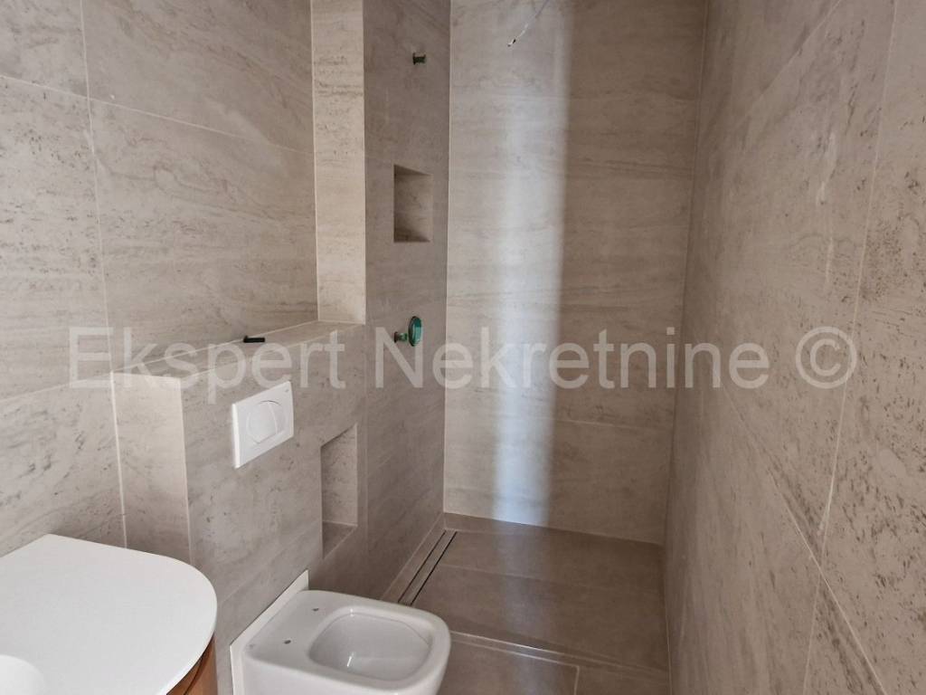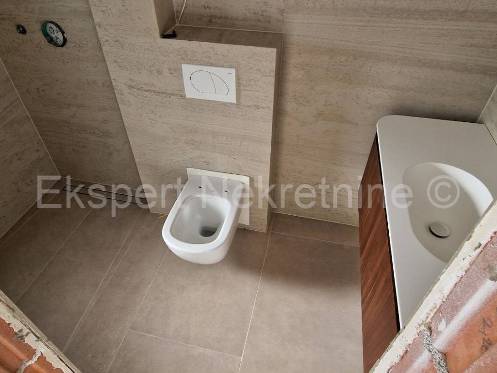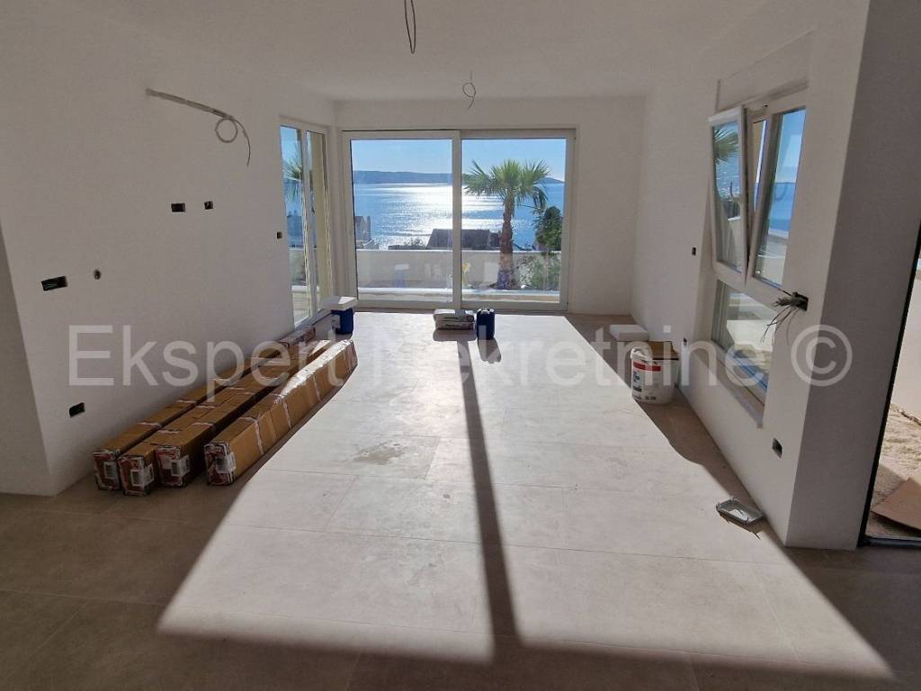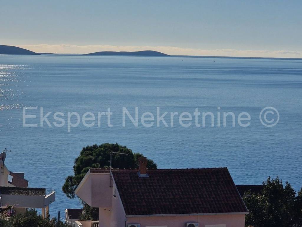 Čiovo, Okrug Gornji, three-bedroom apartment 84 m2 + terrace 30 m2 plus large garden 202 m2 plus private pool 19 m2 in a new building, only 220 m from the sea and beach with sea view. The apartment is located on the ground floor of the building, east-south-west oriented, and consists of three bedrooms, one of which has its own bathroom, bathroom, hallway, kitchen with dining room and large living room and terrace (30m2) and garden (202 m2) and pool (19m2). Although the apartment is on the ground floor, it has an open view of the sea and islands. The apartment also has one large outdoor parking space.The building is located in a great location, south side of Čiovo, only 220 m from the sea and beach. Quality construction (quality ceramics, underfloor heating in the entire apartment, air conditioning in all rooms, mosquito nets, electric blinds, PVC joinery, etc.). The building is in the phase of rough construction works and the planned completion is the end of 2025.Payment by construction stages. Ownership in order.For more information, contact the agency.