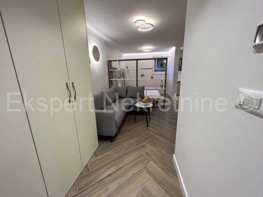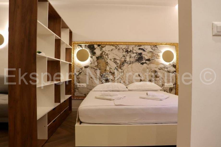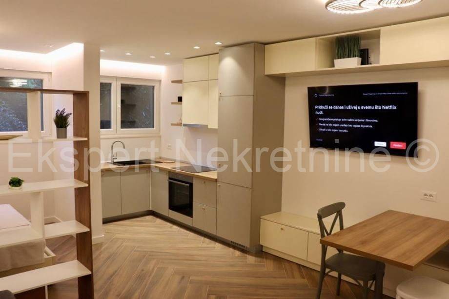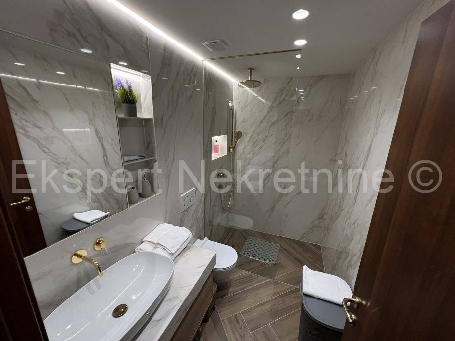 The building is located in a quiet neighborhood surrounded by greenery, close to all necessary amenities, and the apartment overlooks a large garden/wooded park. Straight entrance to the building all the way to the apartment without stairs, which is suitable for disabled people. Free public parking is available within the building.Characteristics of the apartment:- armored door with additional locking/unlocking via PIN and/or magnetic card, suitable for tourists- bathroom door with magnetic lock- a smart system of turning off/on electricity via a coded magnetic card when leaving and entering (all consumers such as air conditioning, lighting, washing machines are turned off, except for essential ones such as a refrigerator, water heater...)- electric lifting of ALU blinds via a switch- el. underfloor heating in the entire apartment with separate lighting for the bathroom and the rest of the apartment- top led lighting with special hidden lights for curtains- schuco PVC windows with three-layer glass filled with Argon gas and additionally mosquito nets- Italian first-class porcelain floor and wall ceramics- German and Italian sanitary ware HANSgrohe shower set, Paffoni, Catalano sink and rimless basin with slow-down board and cataglaze plus 99.99% Silver Titanium protective antibacterial coating for easy maintenance, built-in Geberit cistern, remote reading water meter- hidden shower channel, double tempered shower glass, illuminated wall niches- installed a Mitsubishi air conditioner and a high-quality Ariston Velis water heater that is designed to be hidden in the dining room closet, and the water heater is connected to the kitchen and bathroom- porcelain bed headboard with baroque gold frame with built-in lighting and all light switches, blinds and internet optical connection