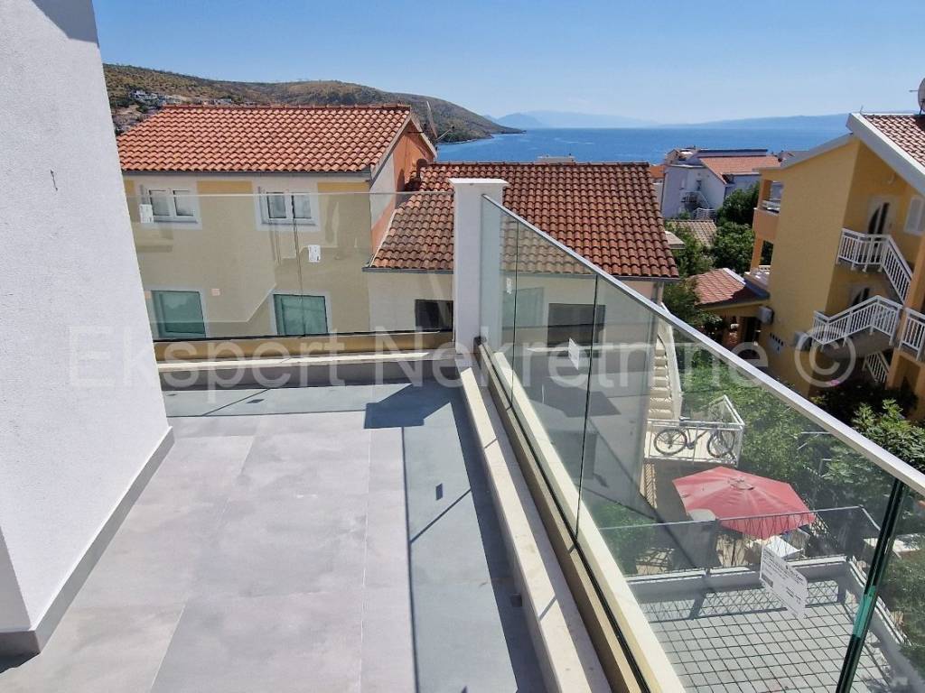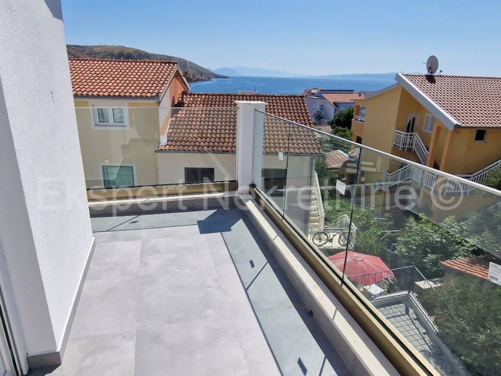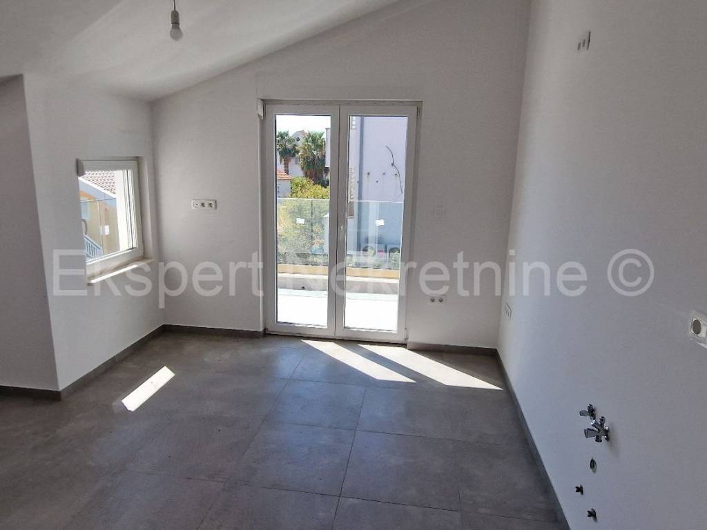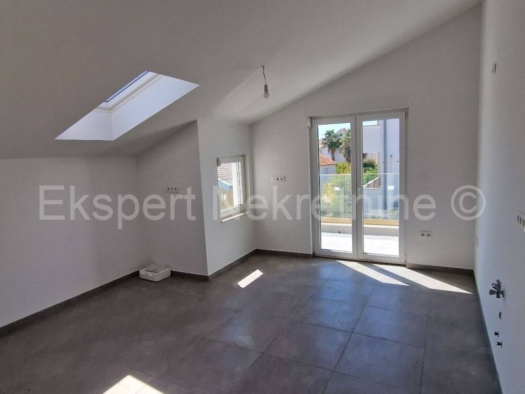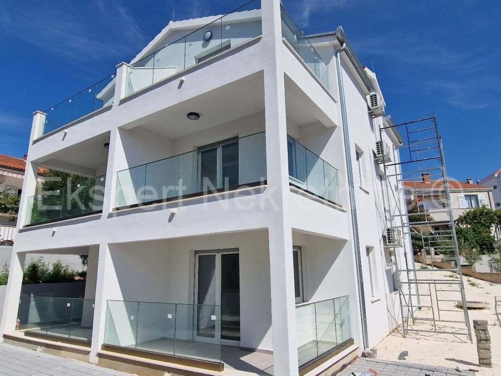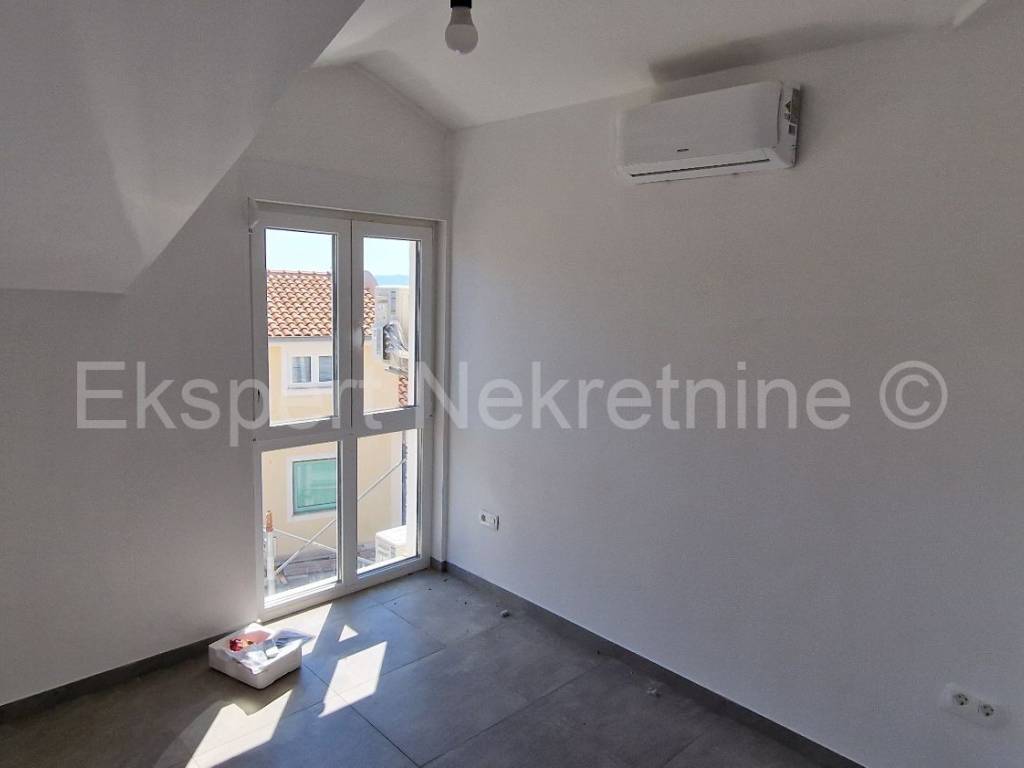 Čiovo,Okrug Gornji , small two-room apartment 54 m2 in a new building with a view of the sea in a building with 6 apartments. The apartment is located on the 2nd (last) floor of the building, and consists of one larger and one smaller bedroom, bathroom, hallway, kitchen with dining room and living room, large terrace with an open view of the sea. It is oriented south-east, and will be fully furnished and equipped with quality furniture and Bosch appliances. Quality construction (quality stone ceramics, air conditioning in every room, underfloor heating bathrooms, PVC joinery, radiant heating in the living room, etc.). The building is under construction, and the planned move-in is in the summer of 2024. Payment by construction stages. The apartment is only 200 m from the sea and the beach, and nearby there is also a shop, restaurants and cafes. Along with the apartment, it is necessary to buy one outdoor parking space, the price of which is 10,000 euros and is paid separately from the price of the apartment. Ownership and construction documentation are in order.