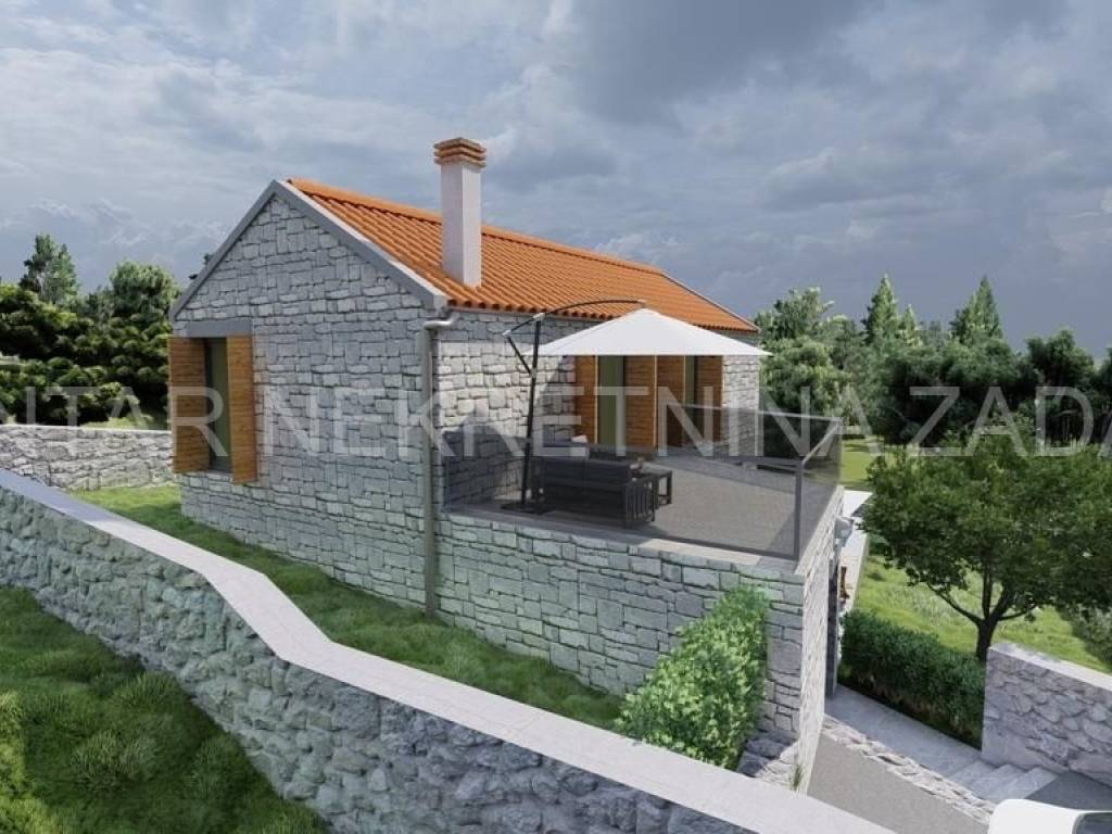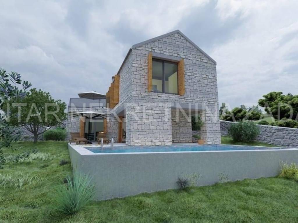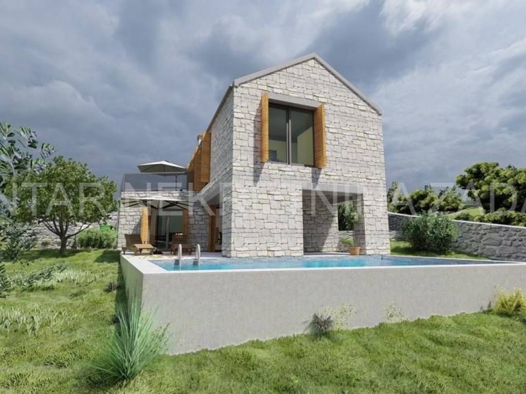 Stone villa under construction in Novigrad, about 30 km from Zadar, near the sea, with a swimming pool and a panoramic view of the sea. The villa is under construction and consists of a ground floor and an upper floor.