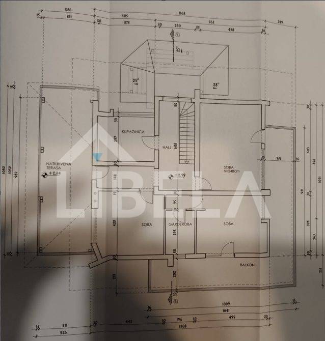 Na katu se nalaze tri velike spavaće sobe, mala soba, kupaonica, balkon i velika natkrivena terasa.