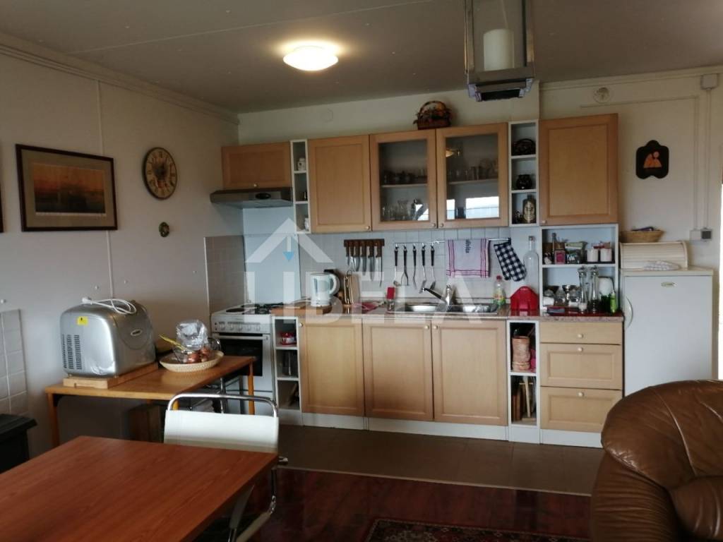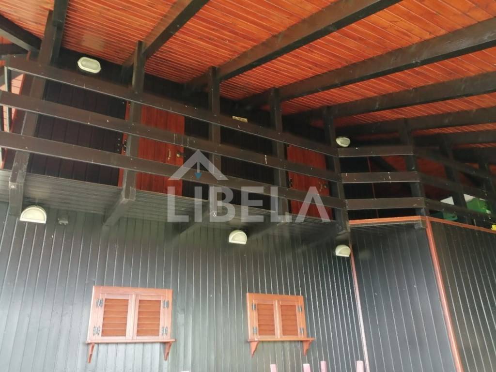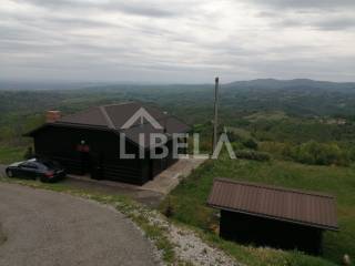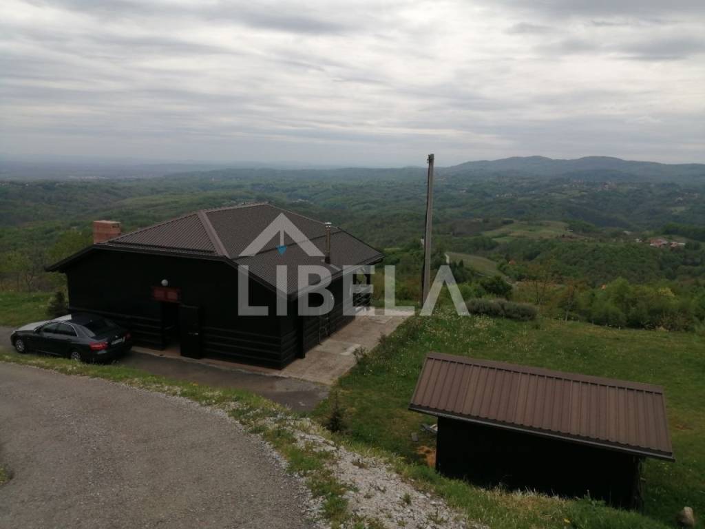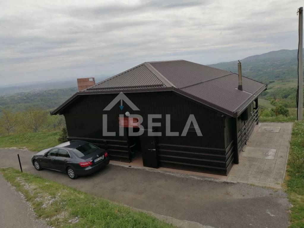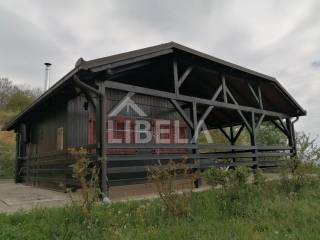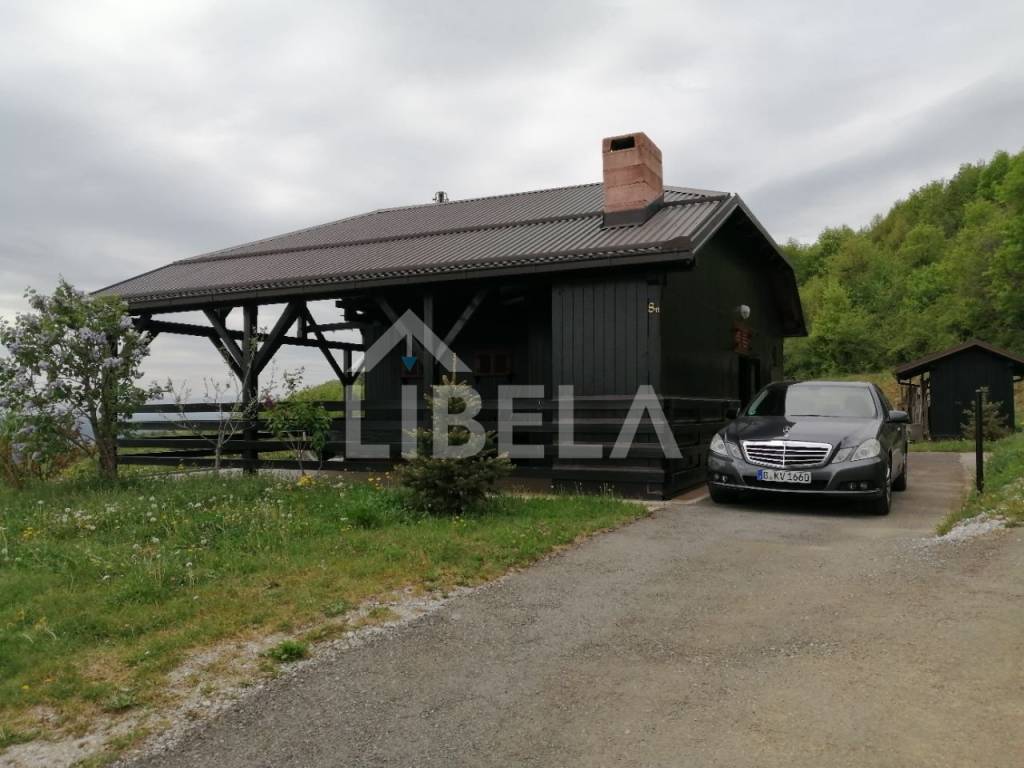 Stambeni objekt održavan i namješten-potpuno opremljen cca. 9 godina star, drveni montažni (ručno-zanatski rađeni, ne tipski-industrijski), tlocrtne površine-/dimenzija 9,70 x 9,73 m (od čega terasa iznosi 50,45 m2), s ulaznim prostorom, dnevnim boravkom, tuš/WC-om i terasom u prizemlju te dvjema spavaonicama, WC-om i spremištem u potkrovlju, kamin-roštiljem na terasi - sve pod jednim krovom, vanjski tuš + zasebni pomoćni objekt-spremište površine 8,25 m2