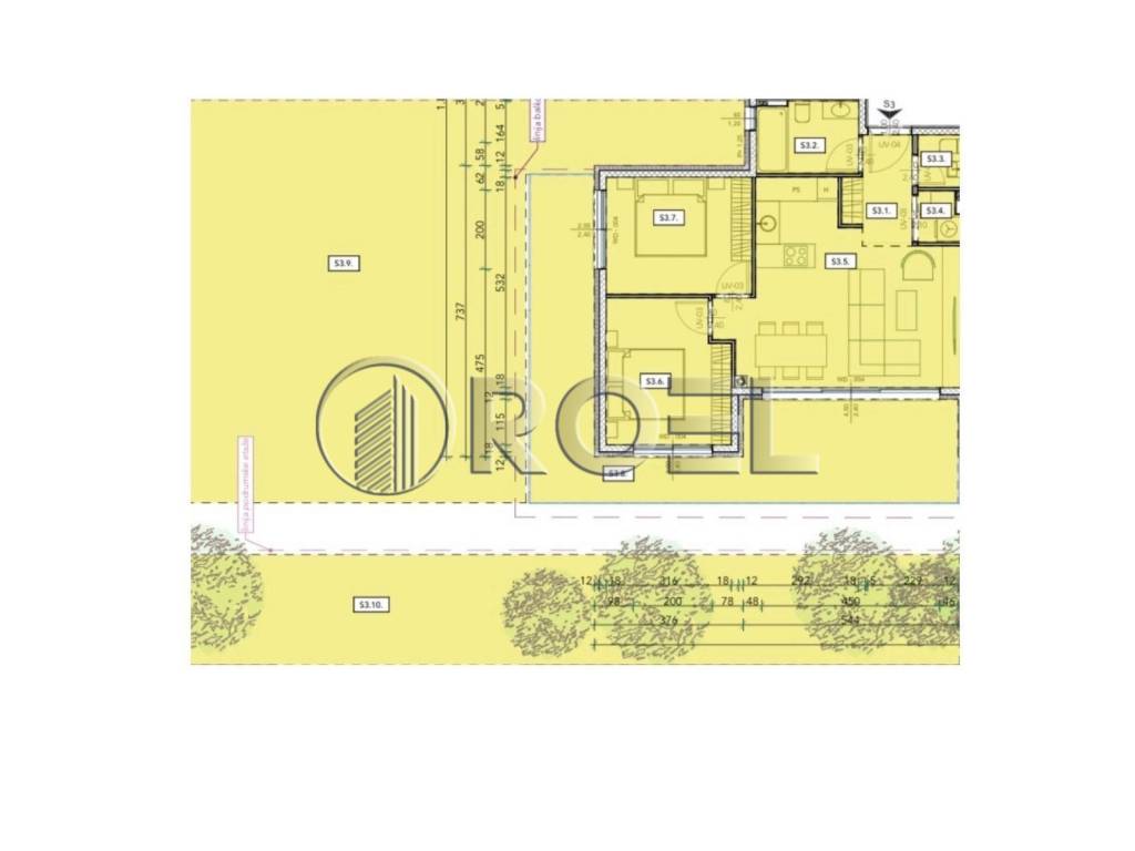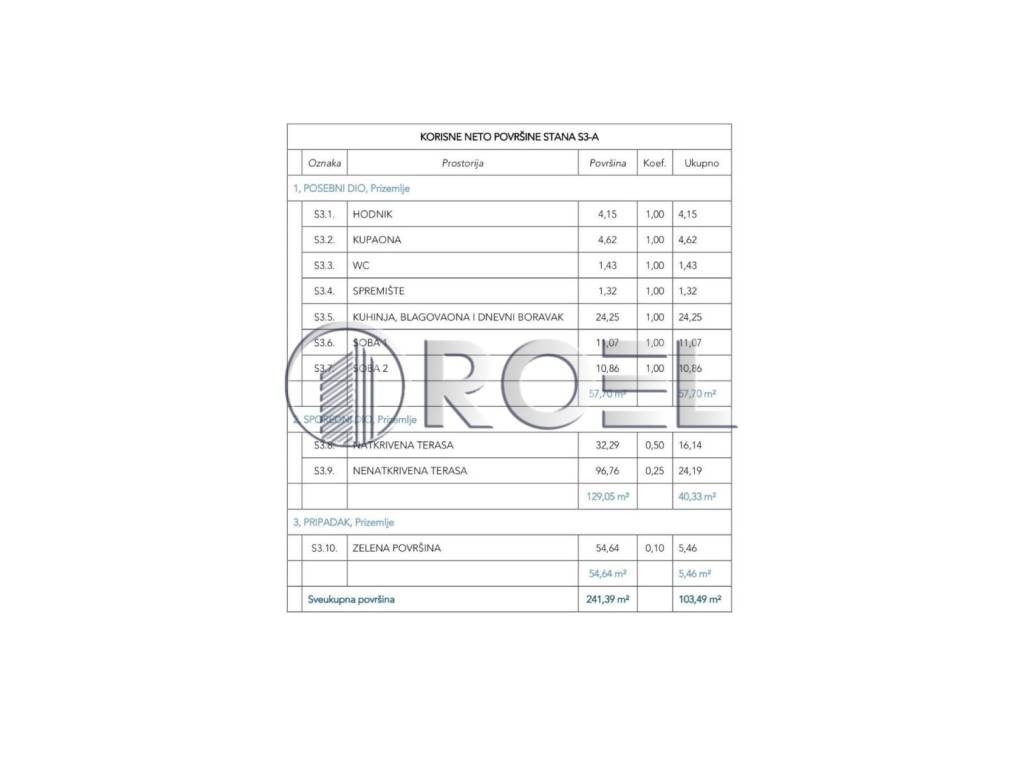 The apartment is located on the ground floor of a modern new building with an elevator, NKP 108 m2. Very modern design of the building and built to the highest standards. It consists of a hallway (4.15 m2), utility room (1.32 m2), bathroom (4.62 m2), toilet (1.43 m2), kitchen, living room and dining room (24.25 m2), two bedrooms (11.07 and 10.86 m2) and a covered and uncovered terrace (40.33 m2) and a garden of 60 m2 (6 m2). The living area of the apartment is 57.70 m2.