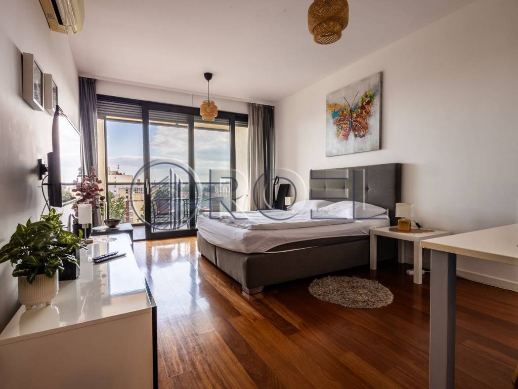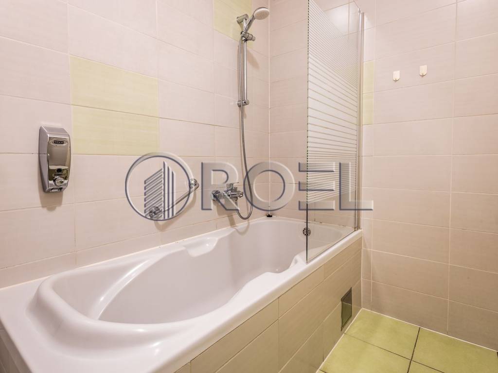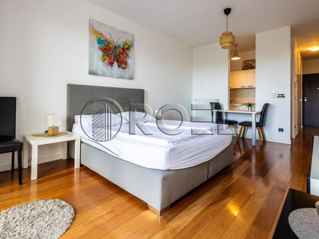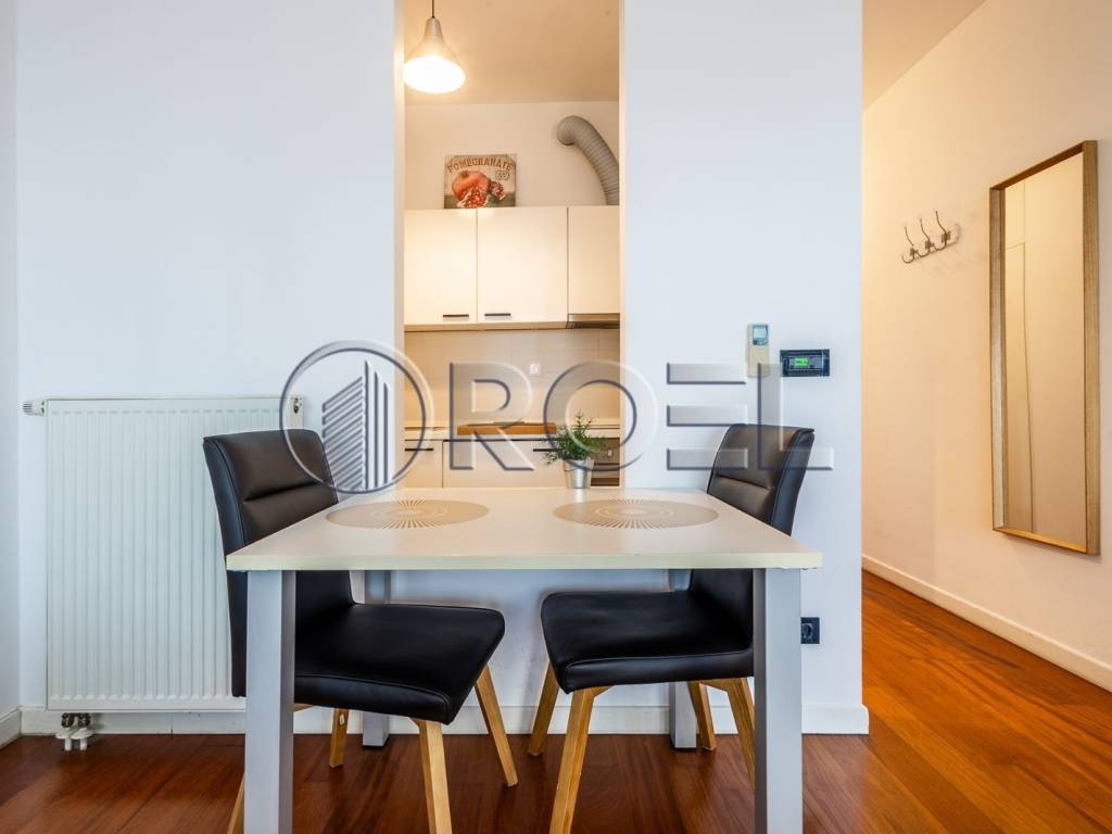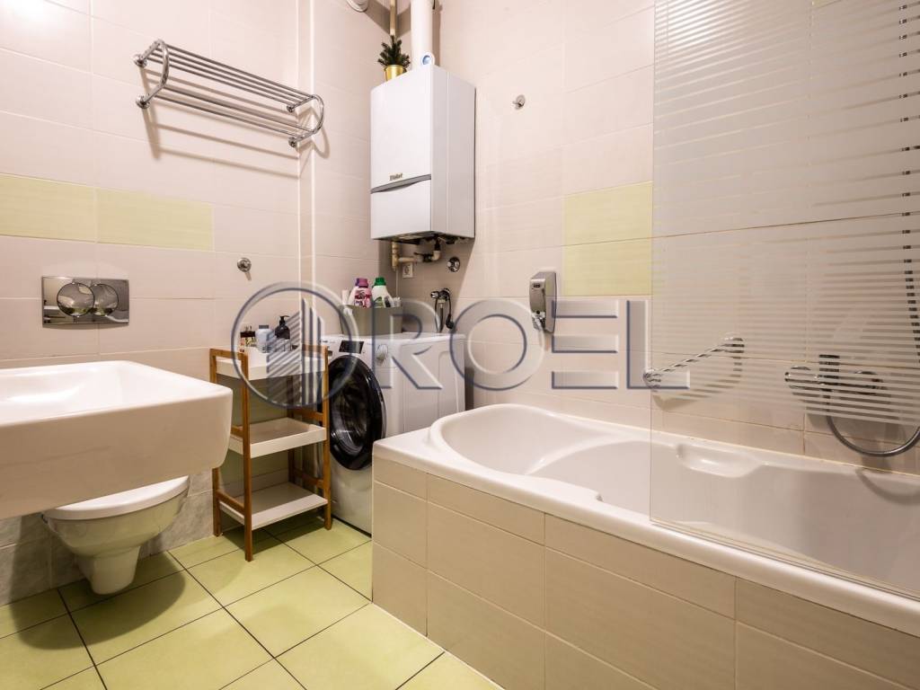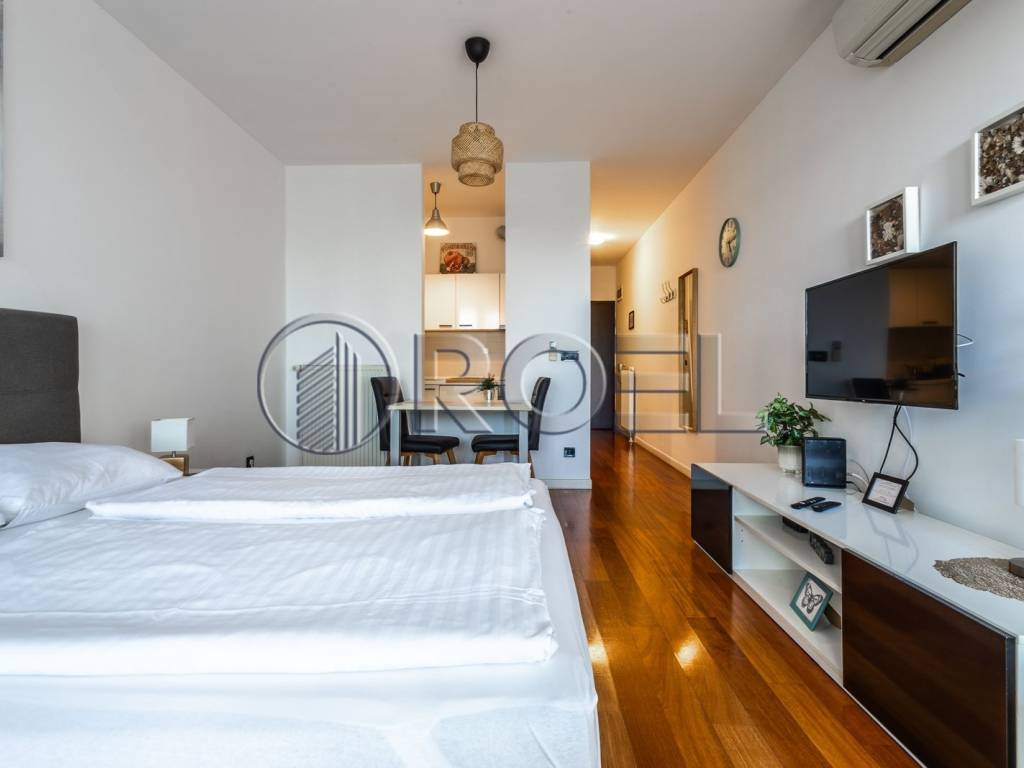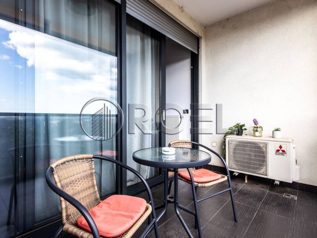 The apartment is southwest-facing, which ensures plenty of daylight and a pleasant atmosphere throughout the day. It consists of one spacious room, a bathroom with a bathtub and a functional kitchen with a dining room. High-quality aluminum joinery, gas central heating and air conditioning guarantee comfort throughout the year, and security doors additionally contribute to security.