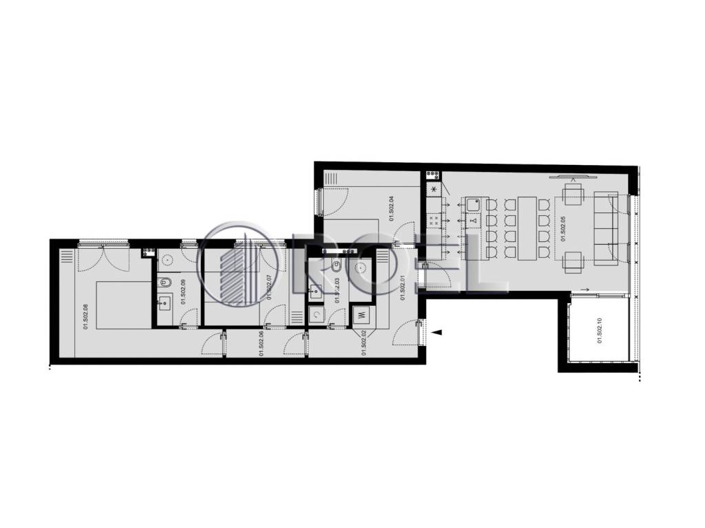 Four-room apartment located in Medveščak, NUA 102.23 m. The living area is 98.09 m. It is situated on the 1st floor of a building with a total of 5 floors. The apartment consists of an entrance hall with a wardrobe, three bedrooms, a living room with a kitchen and dining area, two bathrooms with toilets, a loggia of 5.52 m (net 4.14 m), and a storage room in the building's basement measuring 13.18 m (net 9.88 m).
