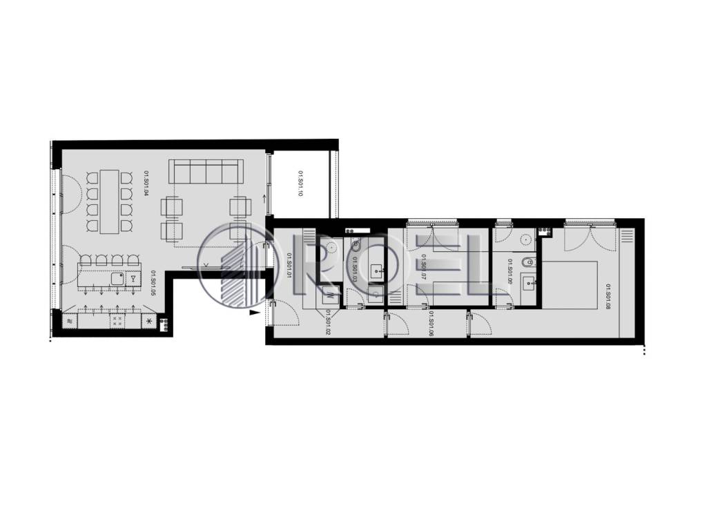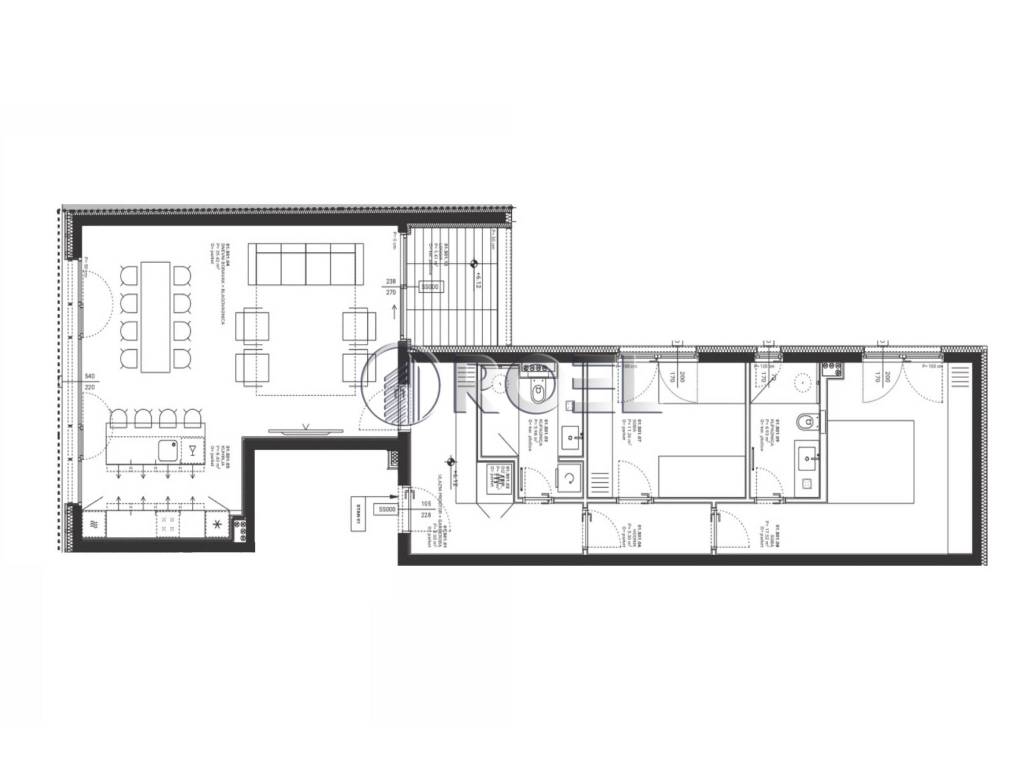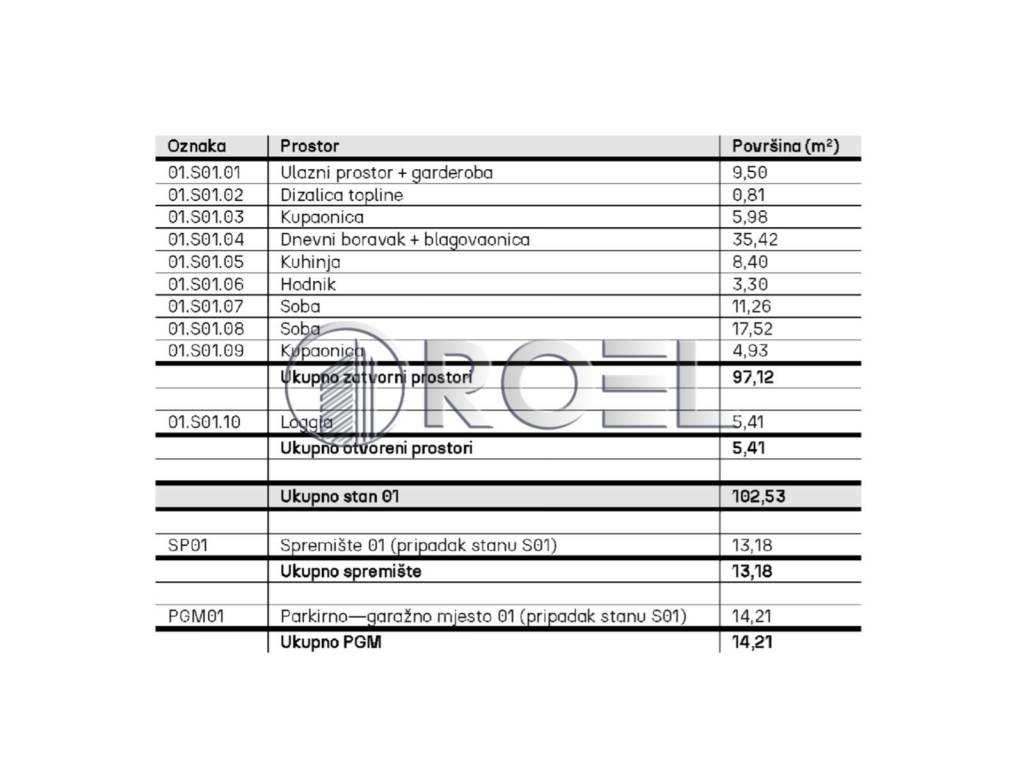 Three-room apartment located in Medveščak, NUA 101.18 m. The living area is 97.12 m. It is situated on the 1st floor of a building with a total of 5 floors. The apartment consists of an entrance hall with a wardrobe, two bedrooms, a living room with a kitchen and dining area, two bathrooms with toilets, a loggia of 5.52 m (net 4.14 m), and a storage room in the building's basement measuring 10.20 m (net 7.65 m).