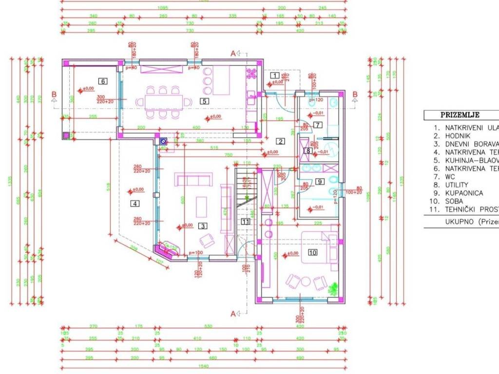 tehničkog prostora, te natkrivene i nenatkrivene terase. Unutarnje stepenište vodi do kata gdje se nalazi predsoblje te tri spavaće sobe, svaka sa svojom kupaonicom.