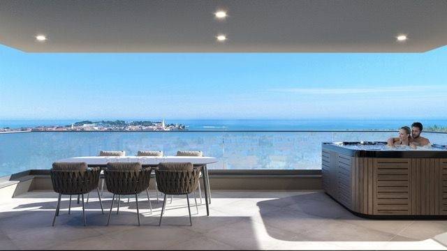 A luxurious two-story apartment for rent in Tar, approx. 3 km from the sea, net area 124.82 m. The apartment is located on the first floor of a residential building with two floors. On the first floor, there is an entrance hall, a bedroom with a bathroom, a wardrobe and a laundry room with a toilet. An internal staircase leads to the second floor of the apartment, where there is a spacious living room, kitchen and dining room with access to a covered terrace, and two bedrooms and a bathroom. The terrace offers a beautiful view of the sea.