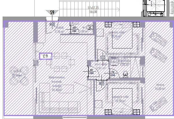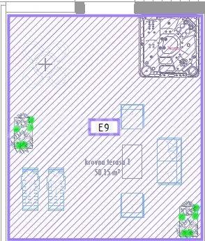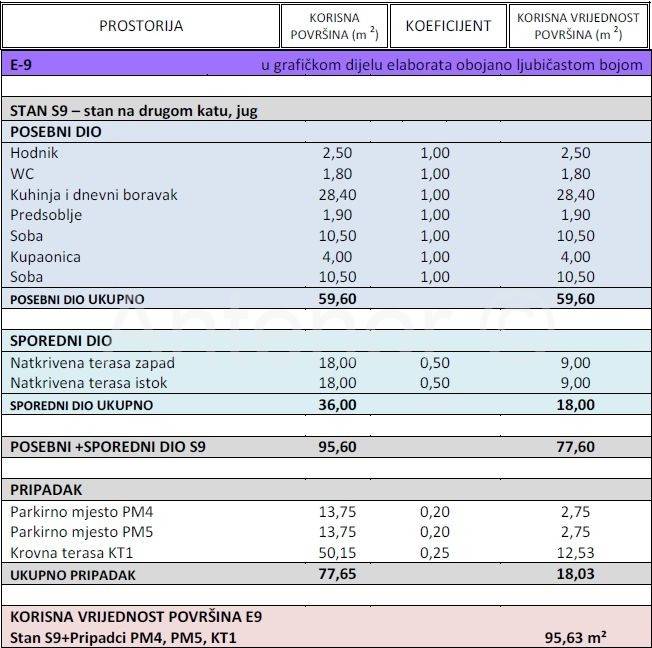 Apartman E-9 nalazi se na drugom katu zgrade, a sastoji se od dvije spavaće sobe, kupaonice, dodatnog wc-a, dnevnog boravka sa kuhinjom i blagovaonicom s izlazom na natkrivenu terasu, dva parkirališna mjesta i krovna terasa s jacuzzijem veličine 50m.