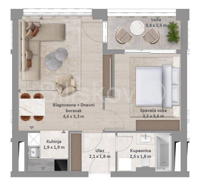 APARTMENT C 102, with an area of 49.32m2, is located on the 1st floor and consists of a bedroom, kitchen with dining room and living room, bathroom and a spacious loggia with access from both the living room and bedroom.