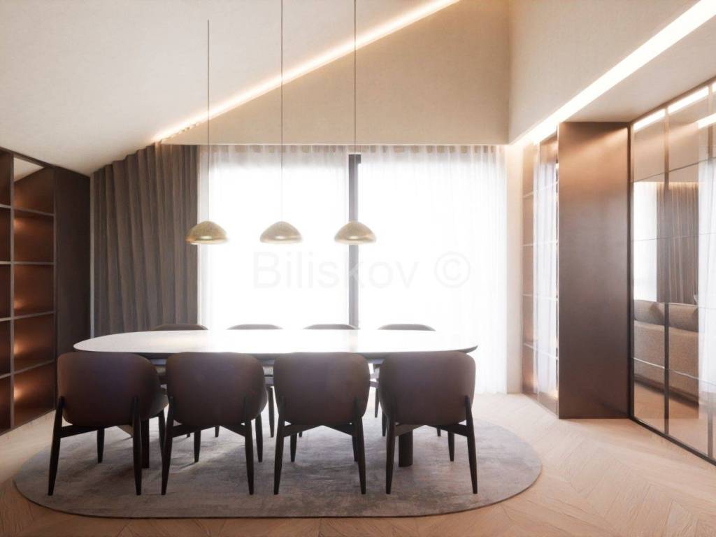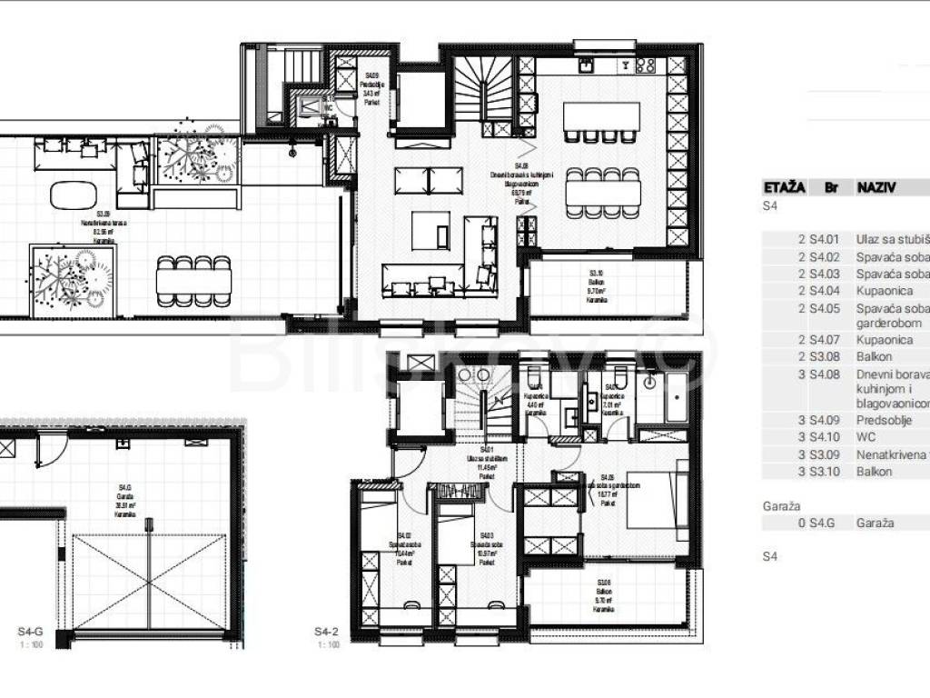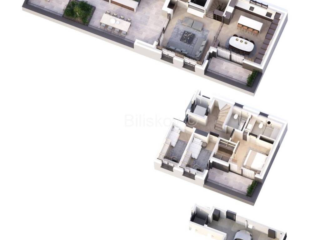 www.biliskov.com ID: 14819СребрнякРоскошный двухуровневый пентхаус общей площадью 202,39 м, расположенный на 3-м и 4-м этажах новостройки.На нижнем уровне расположена спальная зона (две детские комнаты, главная спальня с ванной комнатой, гардеробной и лоджией, общая ванная комната и хозяйственное помещение). На верхнем уровне просторная гостиная, совмещённая с кухней и столовой, большая терраса площадью 90 м, гостевой туалет и прихожая.Этажи соединены лифтом и внутренней лестницей, с прямым доступом на лифте в квартиру.К пентхаусу прилагается гараж на два автомобиля общей площадью 39 м.Квартира имеет большую террасу с панорамным видом на город и гору Медведница.