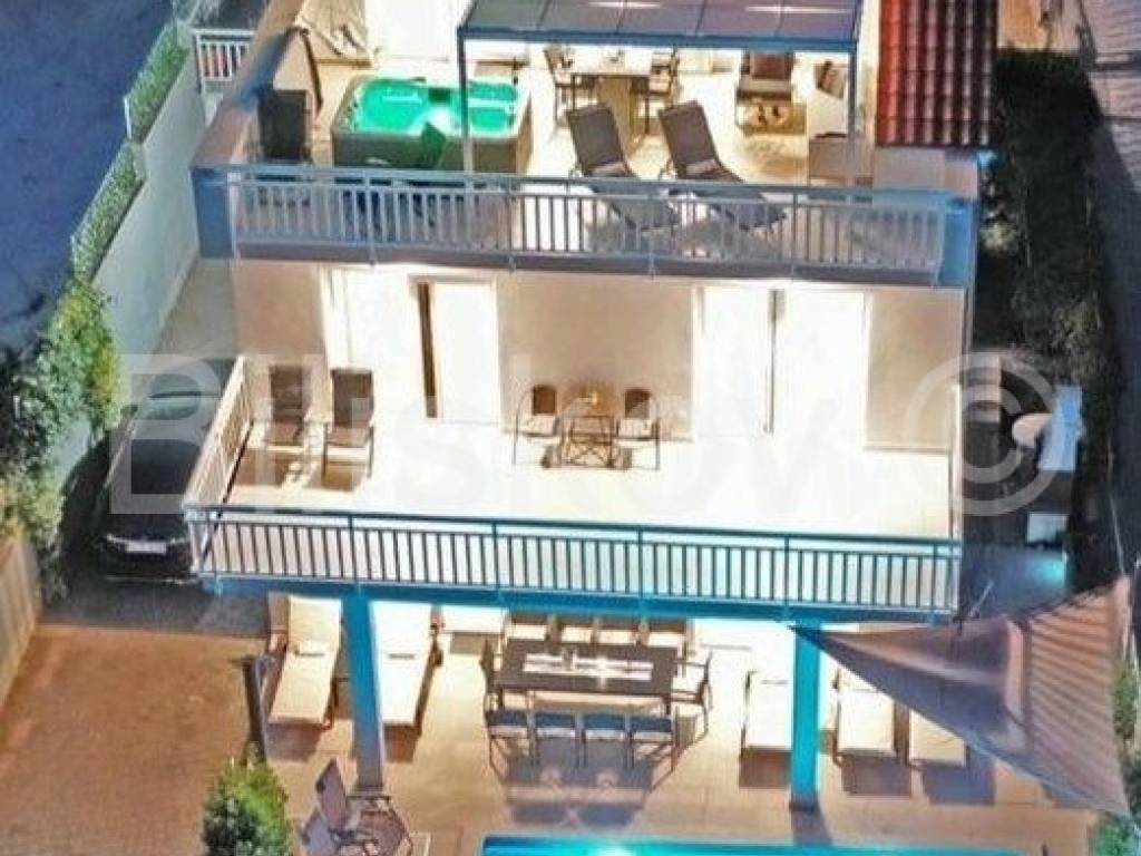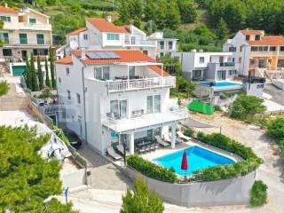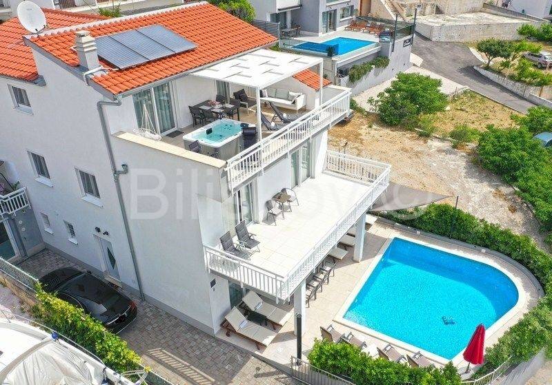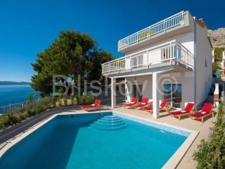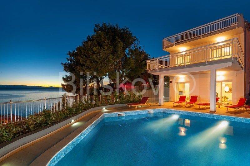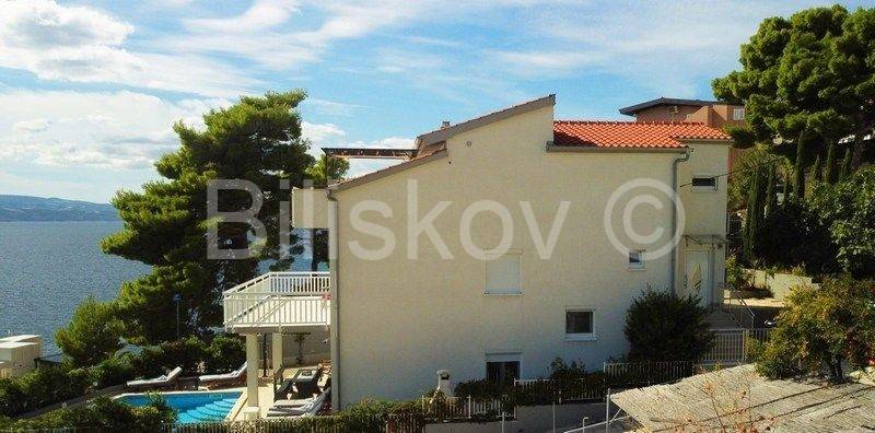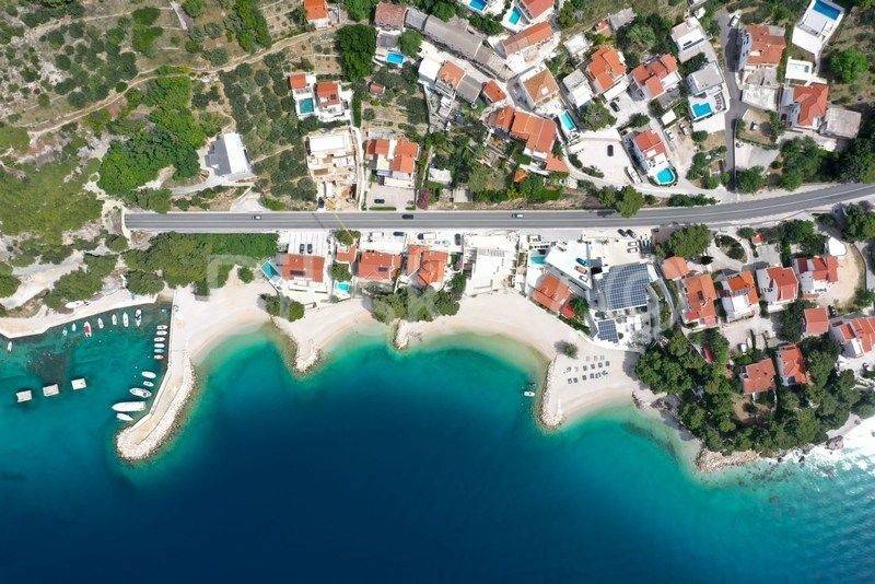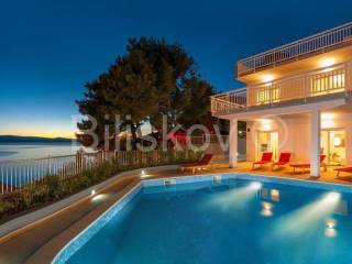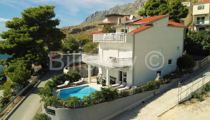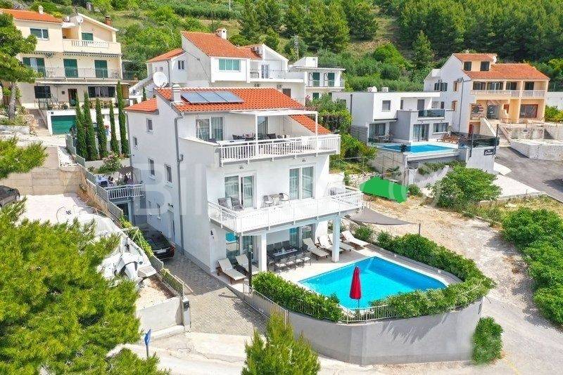 Omiš riviera, Medići - three-story villa with pool 50m from the sea and the beach.In the shade of pine trees, 50m from the sea, there is a three-story house with a view of the sea and the surrounding islands of Brač and Hvar.The area of the house is 294m2 net (gross area 344.88m2), built on a plot of 441m2.The house has two separate entrances and can be used as a whole or separately.On the ground floor there is a garage, gym, sauna, covered terrace, swimming pool.The ground floor and first floor have a living room, dining room, 5 bedrooms, kitchen, 3 bathrooms and a terrace.The last floor is a penthouse with a living room, dining room, kitchen, two bedrooms, a bathroom and a large terrace with a jacuzzi.The house has 5 parking spaces, a fenced yard with gates, a large swimming pool and is fully furnished.7 bedrooms, 2 kitchens, 2 living rooms, each room is air-conditioned, 4 bathrooms with showers, Bio pit, 4 terraces, outdoor grill, sauna, gym, garden.Solar energy.Currently, the house is used for tourist purposes, has a 4* classification and can host 16 people at once.Suitable for tourism and housing.