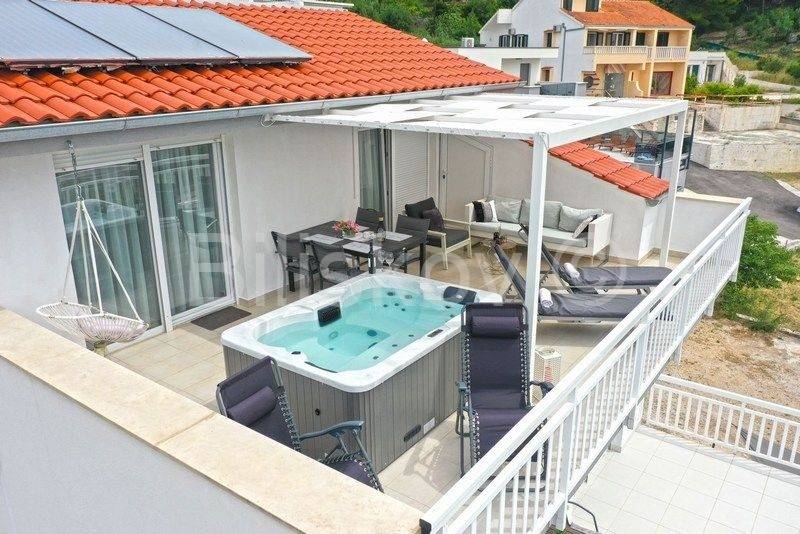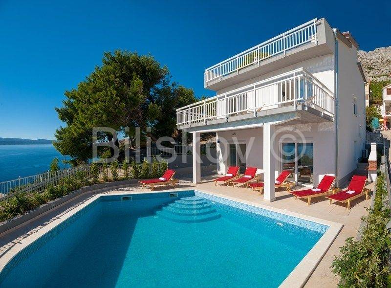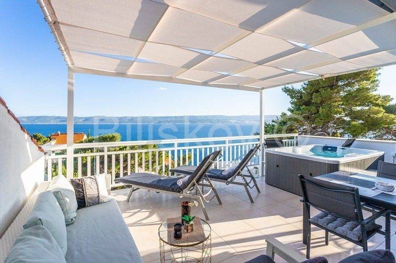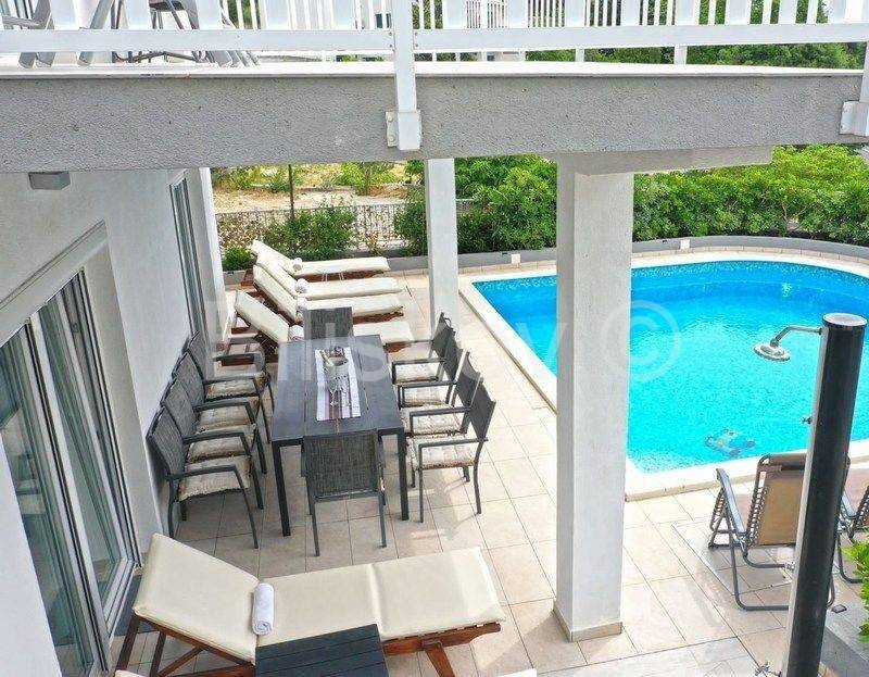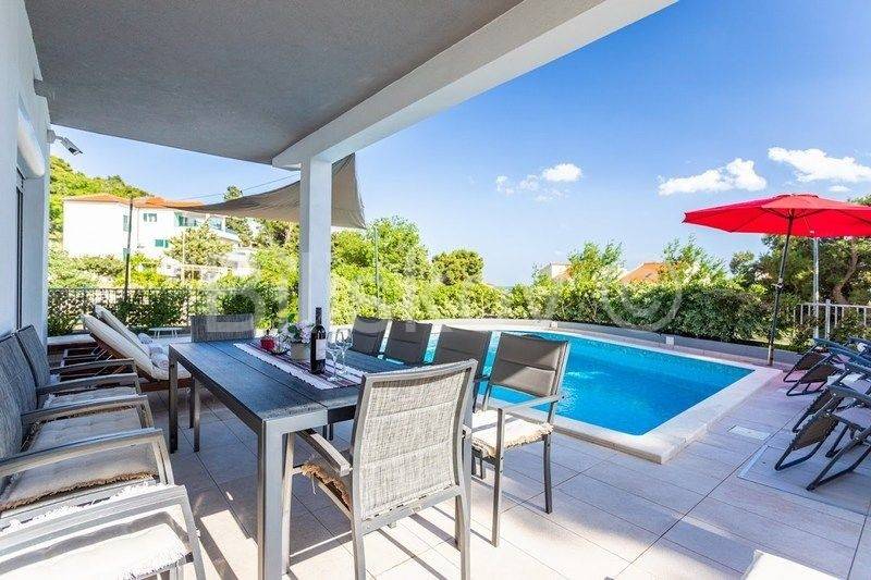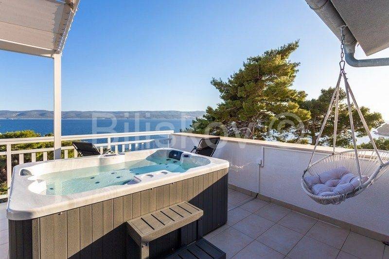 Omiš riviera, Medići - three-story villa with pool 50m from the sea and the beach.In the shade of pine trees, 50m from the sea, there is a three-story house with a view of the sea and the surrounding islands of Brač and Hvar.The area of the house is 294m2 net (gross area 344.88m2), built on a plot of 441m2.The house has two separate entrances and can be used as a whole or separately.On the ground floor there is a garage, gym, sauna, covered terrace, swimming pool.The ground floor and first floor have a living room, dining room, 5 bedrooms, kitchen, 3 bathrooms and a terrace.The last floor is a penthouse with a living room, dining room, kitchen, two bedrooms, a bathroom and a large terrace with a jacuzzi.The house has 5 parking spaces, a fenced yard with gates, a large swimming pool and is fully furnished.7 bedrooms, 2 kitchens, 2 living rooms, each room is air-conditioned, 4 bathrooms with showers, Bio pit, 4 terraces, outdoor grill, sauna, gym, garden.Solar energy.Currently, the house is used for tourist purposes, has a 4* classification and can host 16 people at once.Suitable for tourism and housing.