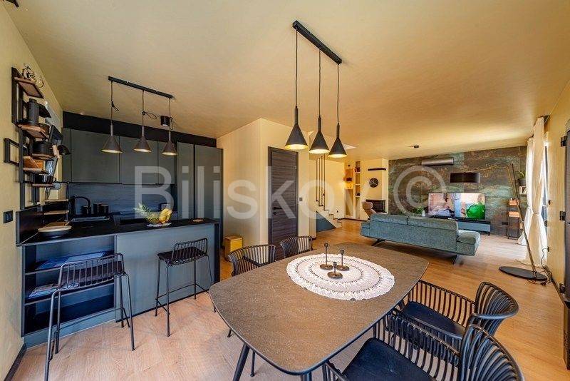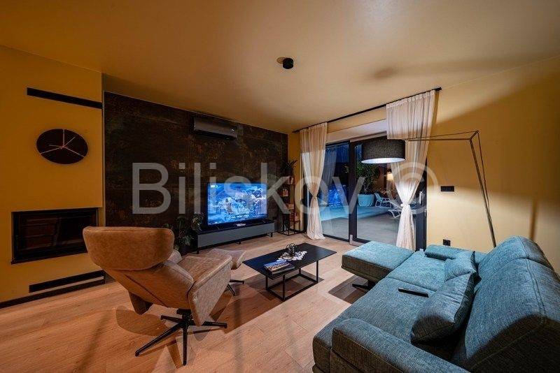 On the ground floor there is a kitchen with a dining room and a living room, a toilet, an outdoor covered kitchen with a grill and a table. Large glass walls along the entire length of the living room and dining room allow an open view of the bay, the pool and the large terrace. There is a modern fireplace in the living room. There is a "playground" area on the side of the house.