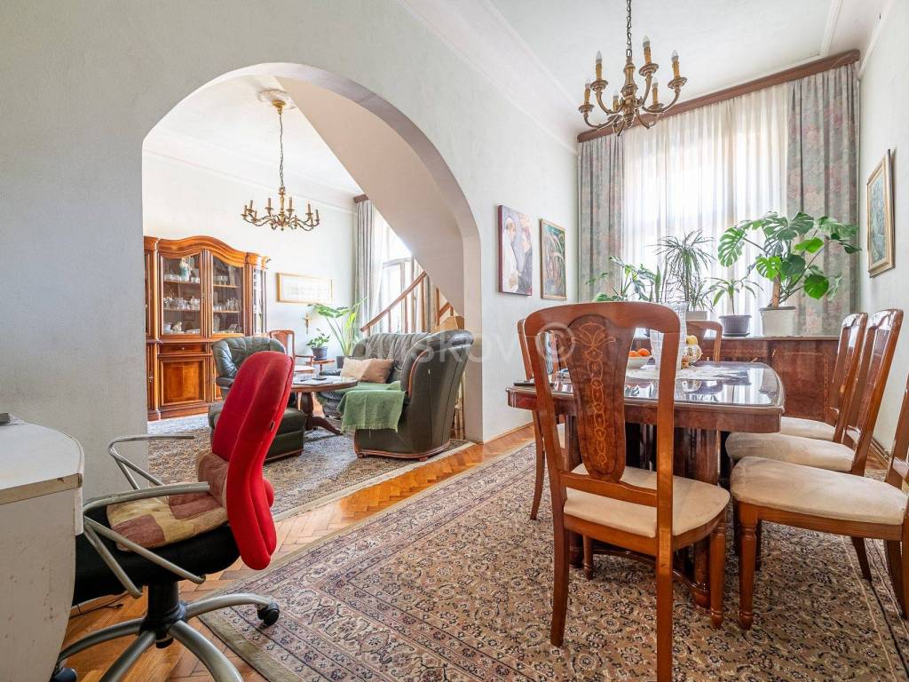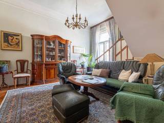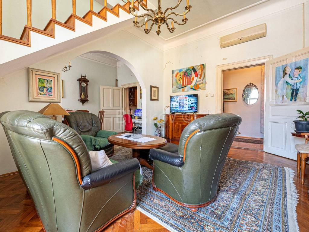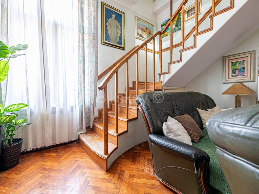 Пятикомнатная двухэтажная квартира площадью 136,75 м2 на 2 и 3 этаже жилого дома 1930 года постройки.