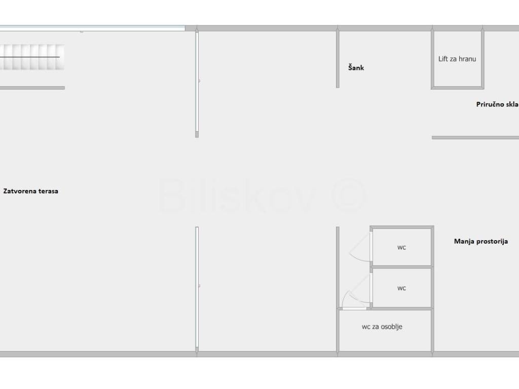 Состоит из закрытой террасы площадью 40 м2, внутренней части помещения площадью 59,22 м2, в которой расположены мужской и женский туалет, большой комнаты, меньшей комнаты, бара, магазин за барной стойкой, грузовой лифт для продуктов питания и напитков, ведущий на склад в подвальном здании площадью 28,32 м2. Часть склада переоборудована под кухню и имеет дополнительный м/ф туалет.