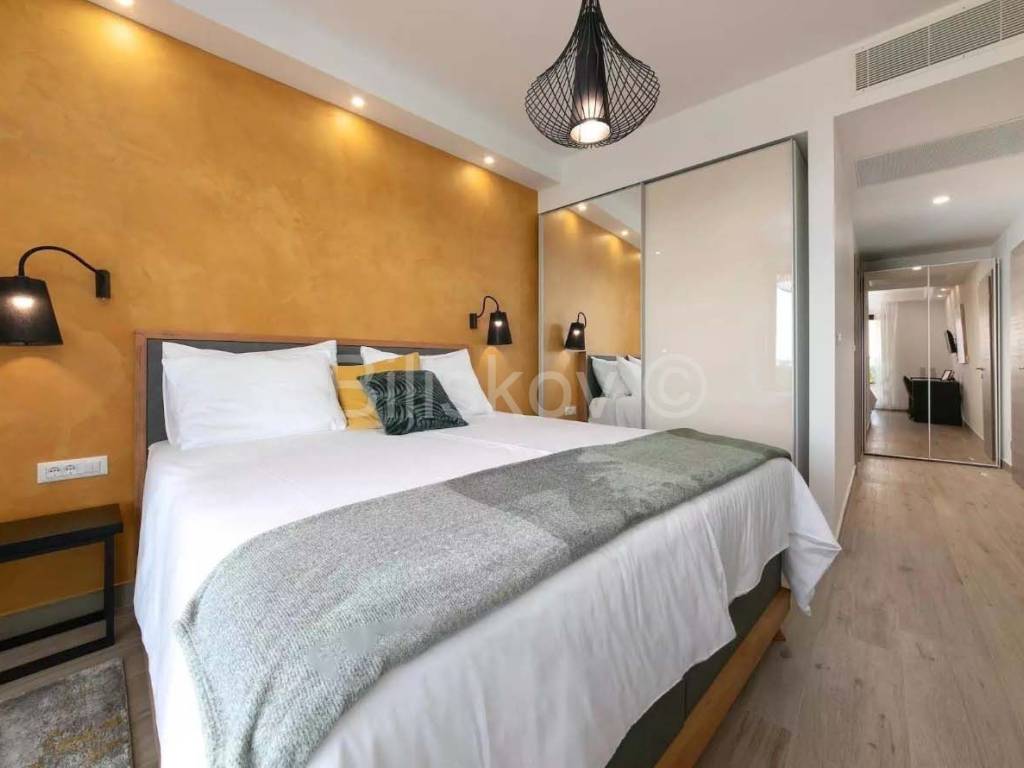 Наверху есть три спальни и три ванные комнаты, а также терраса с фантастическим видом. В каждом номере есть кровать "кинг сайз" шириной 180 см, большой шкаф с сейфом, а также стол, тумбочки и стеллаж для чемоданов из дуба.