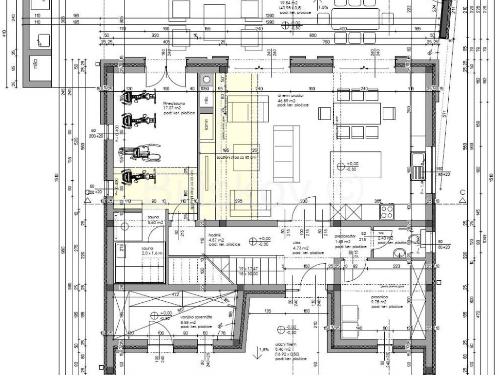 В задней части дома есть еще одна большая терраса, где можно расслабиться и насладиться красивым пейзажем или утренним солнцем. На террасу завезли полную установку для запланированной установки сауны и кондиционера для спортзала и/или игровой комнаты. В ванных комнатах есть душевая кабина со стеклянной стеной и стенной нишей, а также дизайнерская раковина, встроенная в тумбу, изготовленную на заказ. В каждой ванной комнате установлен настенный радиатор.
