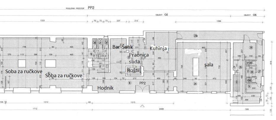 Poslovni prostor- Restoran, površine 333,80m2 u prizemlju dvorišne zgrade sagrađene 1867 godine. Poslovni prostor je roh bau. Adaptacija prostora izvršena je 2020 godine. Prostor se sastoji se od: ulaznog hodnika, tri prostora sanitarija, tri WC-a, pisoara, kuhinje, gospodarskog ulaza, hladnjače, hodnika, dvije garderobe, tuša, ulaza u podrum i skladišta u podrumu, te natkrivenog prolaza u prizemlju. Visina stropova je 3,50m. Zgrada je uredna i održavana. Postoji mogućnost postavljanja stolova u dvorištu. Parkiranje je u 1.zoni naplate. Lokacija je sjajna, jer se nalazi u najužem centri grada.
