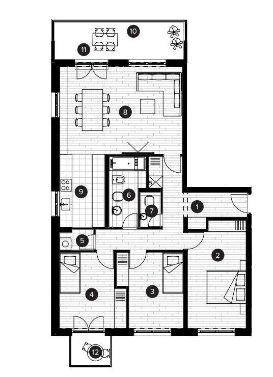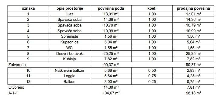 Stan će se nalaziti na prvom katu zgrade, ukupne prodajne površine 98,18m (ukupna neto površina poda iznosi 104,67 m), a sastoji se od ulaznog prostora, open space dnevnog boravka s blagovaonicom, kuhinje, tri spavaće sobe, kupaonice, zasebnog WC-a, natkrivene terase, loggie, balkona i spremišta.