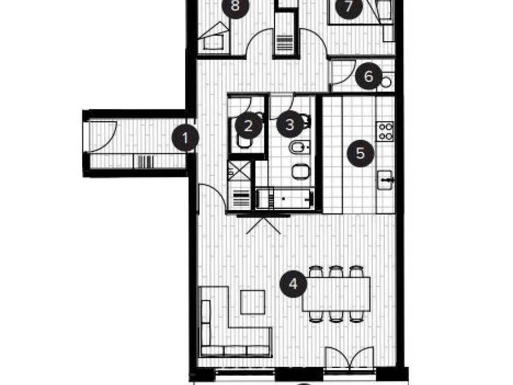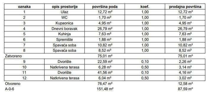 Stan će se nalaziti u prizemlju zgrade, ukupne prodajne površine 87,59m (ukupna neto površina poda iznosi 151,48 m), a sastoji se od ulaznog prostora, open space dnevnog boravka s blagovaonicom, kuhinje,dvije spavaće sobe, kupaonice,zasebnog WC-a, natkrivene terase sa obje strane stana, dvorišta sa obje strane stana i spremišta.