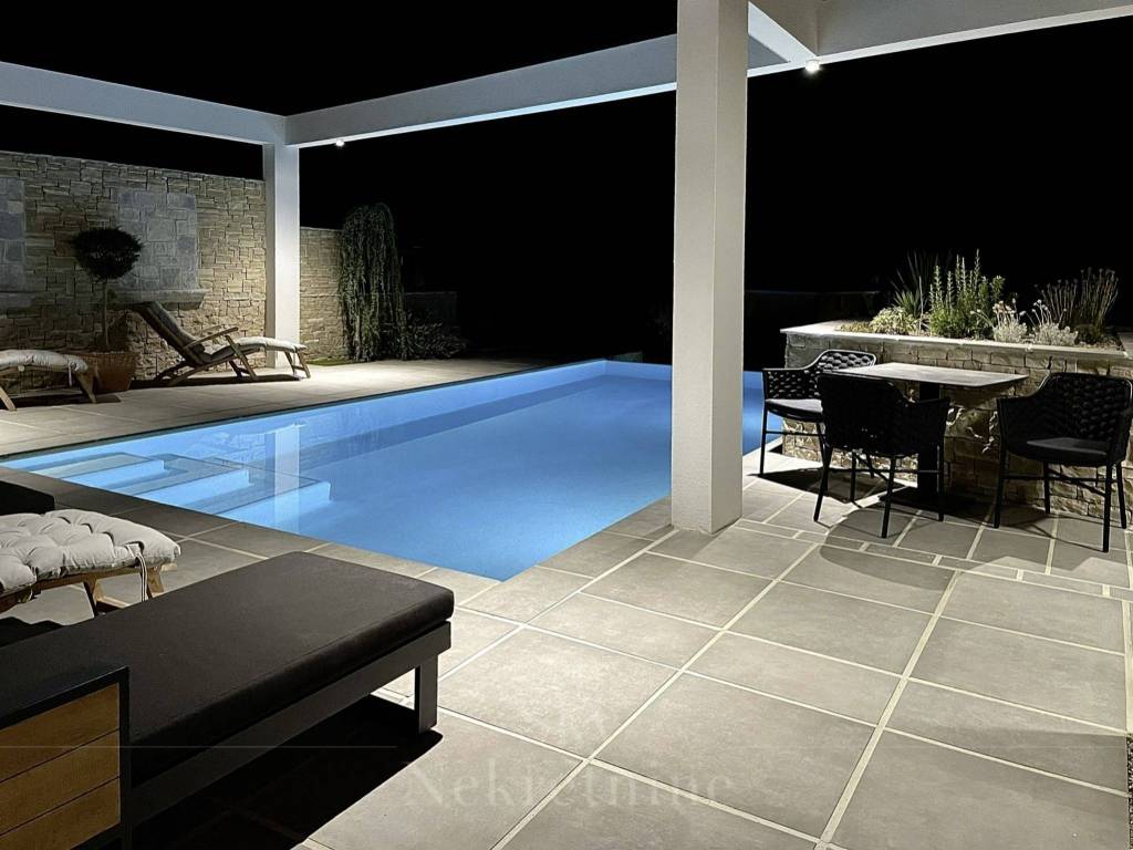 Eksterijer vile osmišljen je za potpuno uživanje infinity bazen s prostorom za sunčanje, ljetna kuhinja s roštiljem, vanjski stol za blagovanje te dodatni prostor za kavu i brunch. Vila također ima parkirno mjesto za tri automobila, prostor za tehničke uređaje i pumpu za bazen.