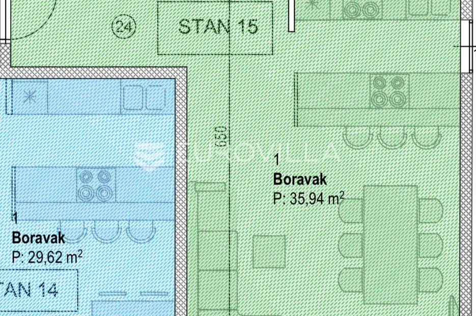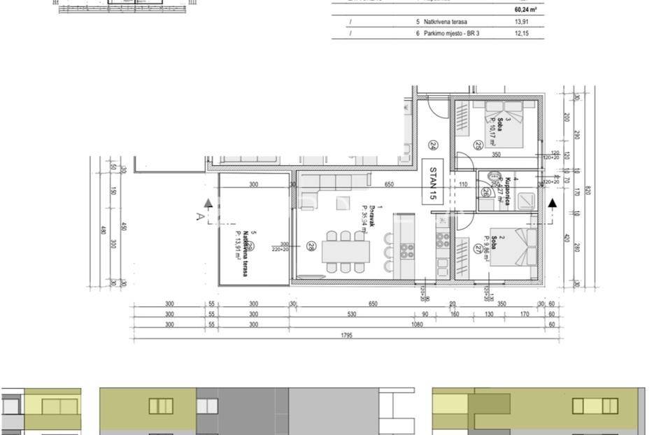Predstavljamo vam projekt moderne novogradnje u novoizgrađenom dijelu Povljane na otoku Pagu. Zgrada se sastoji od ukupno 15 stambenih jedinica raspoređenih na 3 etaže. Udaljena je svega 350 metara od mora, lokalnih plaža i ostalih sadržaja potrebnih za kvalitetan i ispunjen život ili odmor.STAN S15 / 2. kat / 67,19 m²Stan S15 se nalazi na 2. katu zgrade te ima neto korisnu površinu od 67,19m². Sastoji se od otvorenog prostora dnevnog boravka, kuhinje i blagovaonice (35,94 m²), dvije spavaće sobe (10,17m2 i 9,86 m²), potpuno opremljene kupaonice (4,27 m²) te natkrivene terase (13,91m2) s koje se pruža predivan pogled na more. Uz to, stanu pripada i jedno vanjsko parkirno mjesto.Planirano useljenje je 04/2027, zgrada je trenutno u početnim fazama radova.Zgrada će biti opremljena kvalitetnim materijalima, od čega valja izdvojiti:Multi-split klima uređaji u sobama i dnevnim boravcimaKvalitetna vanjska PVC Low-E stolarijaProtuprovalna i protupožarna vrataStaklene ograde na terasamaI još mnogo togaPovljana je šarmantno dalmatinsko mjesto na otoku Pagu, poznato po dugim pješčanim plažama i kristalno čistom moru. Idealan je izbor za nekretnine za odmor ili turistički najam — autentičan dalmatinski ugođaj, prostrane terase i blizina lokalnih restorana. Dobra prometna povezanost cestom te blizina važnijih otočnih i kopnenih odredišta čine Povljanu privlačnom investicijskom lokacijom na Pagu.Obratite nam se s povjerenjem za više informacija i dogovor razgledavanja.