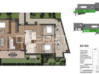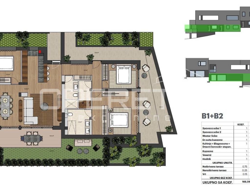 Stan B1+B2 stambene kvadrature 122,55m2 sa prostranom natkrivenom terasom, nenatkrivenom terasom i vrtom sastoji se od prostranog boravka sa kuhinjom i blagovaonicom, master spavaće sobe sa vlastitom kupaonicom, 2 dodatne spavaće sobe, kupaonice i vešeraja.