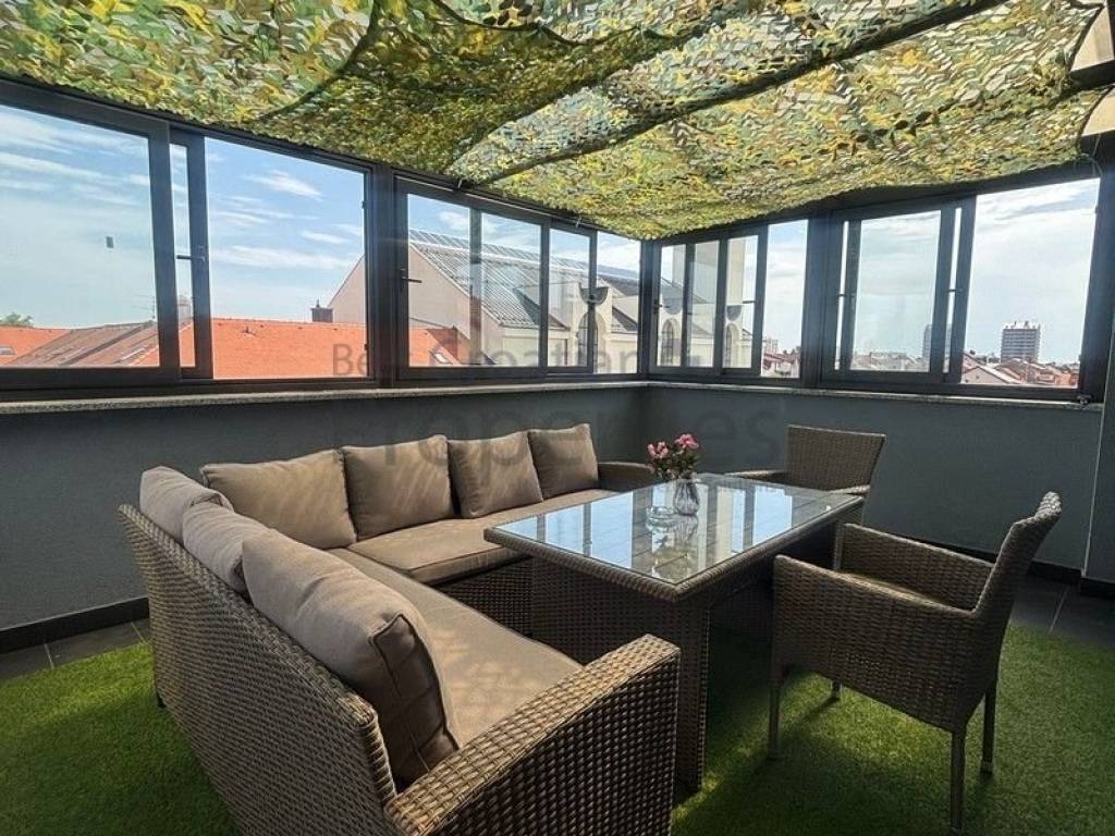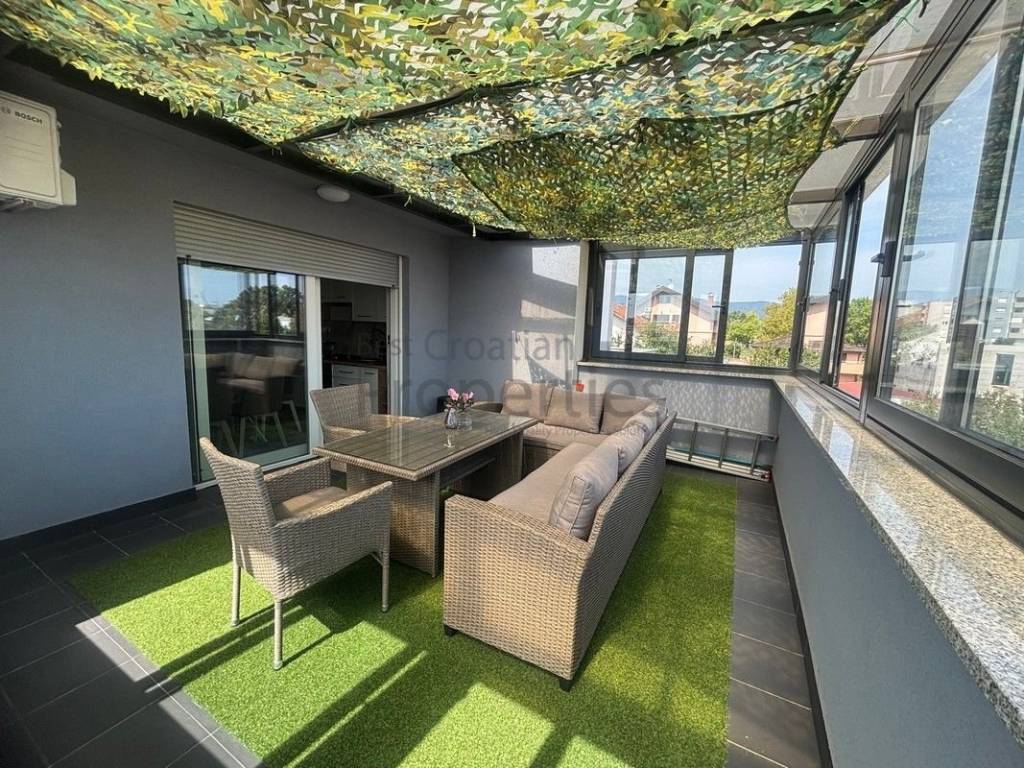 Sastoji se od ulaznog hodnika, dvije spavaće sobe, od koje jedna ima vlastitu zatvorenu loggiu, dnevnog boravka sa kuhinjom i blagavaonom, kupaone, ostave, i velike zatvorene terase (zimski vrt) od 22m2, sa vrtnom garniturom, te odličnim izvorom svjetlosti, koje ovom stanu daje toplinu i udobnost.