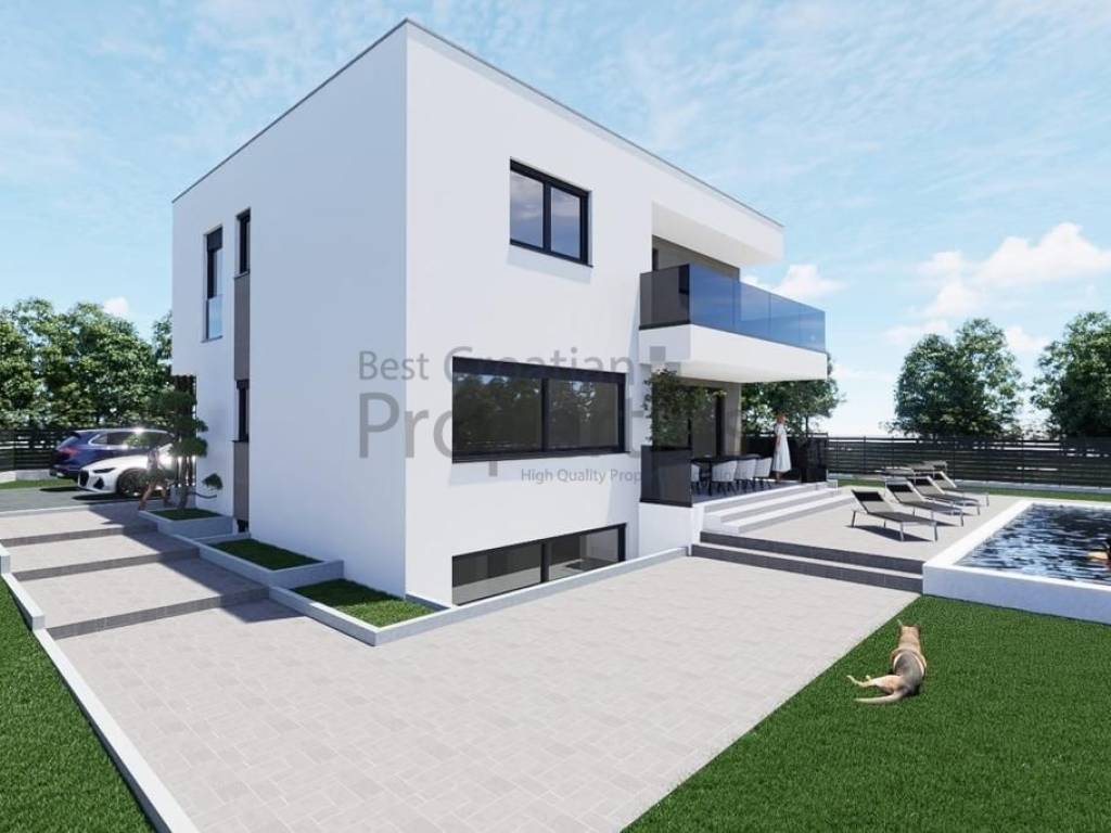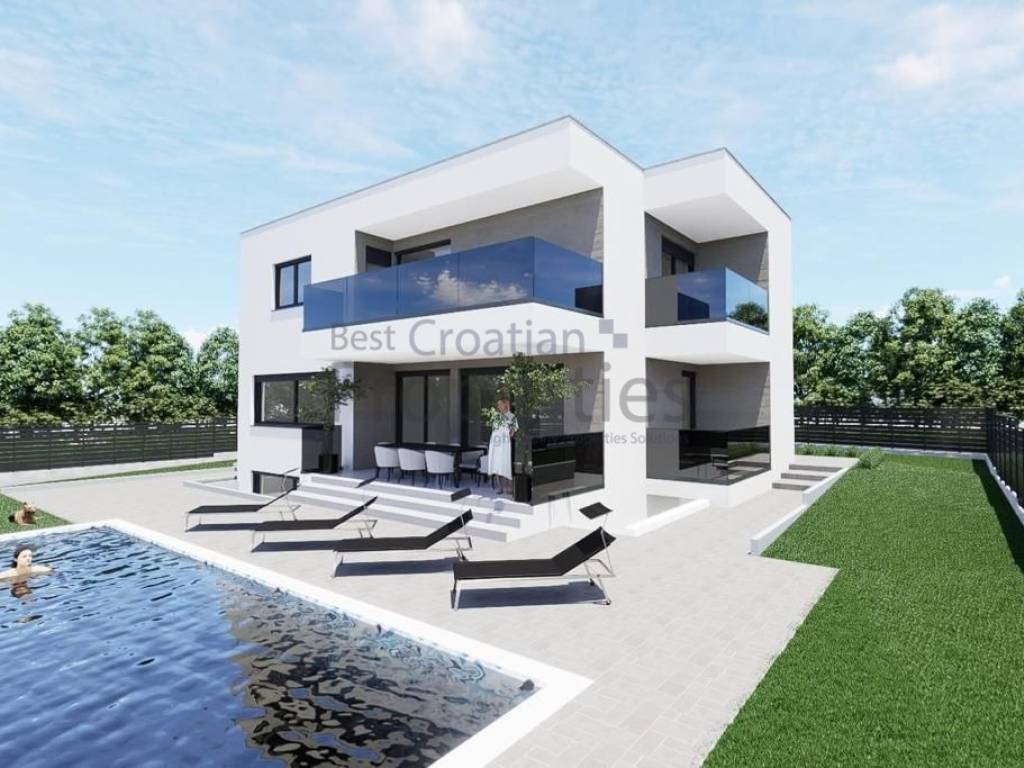 Tel.: 095/564 7500 (Tomislav) agent5@bestcroatianproperties.com PRODAJA ROH BAU STANJE !Prodaje se luksuzna vila na području Smokovića na samo par minuta od Zadra te nekoliko minuta od zračne luke. Cijelo naselje se sastoji od 27 vila. Vila se nalazi na zemljištu od 583m2. Vila je trenutno u visokom Roh bau i kao takva se prodaje. U izgradnji vile se koriste vrhunski materijali i primjenjuju visoki standardi gradnje. Vila se sastoji od prostranog dnevnog boravka, kuhinje, blagovaonice, 3 spavaće sobe, 3 kupaonice, vešeraja, ostave te natkrivene terase. Vili pripada i bazen te komin sa ljetnom kuhinjom. Vila ima predviđena 3 parking mjesta. Svaka vila je ograđena zidom visine cca 165cm čime je privatnost zagarantirana. Vila je prizemnica sa ravnim nepropusnim krovom. Izolacija 10 cm stiropora. Vlasništvo čisto 1/1. Kupac ne plaća porez na promet nekretnina