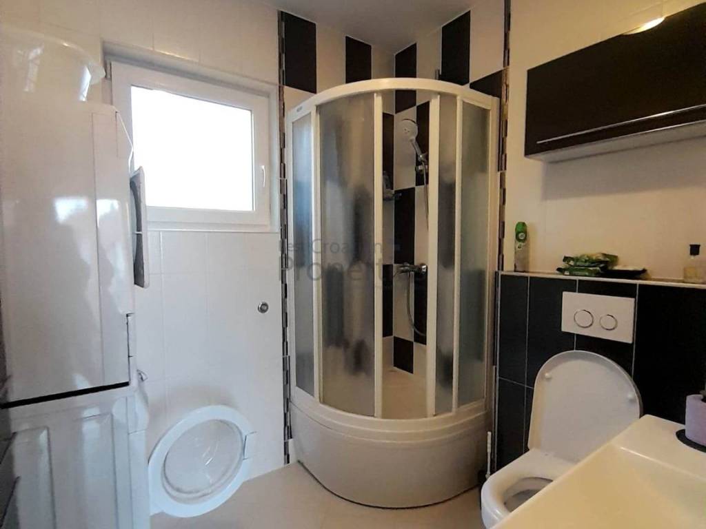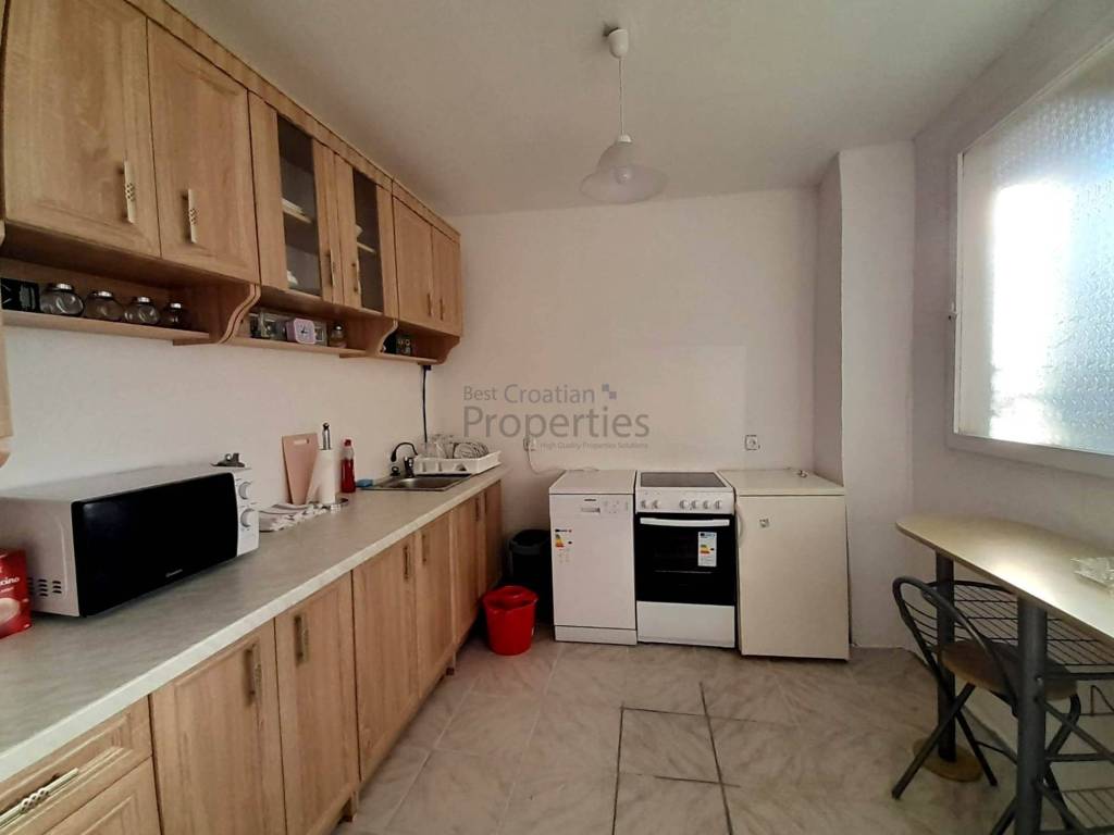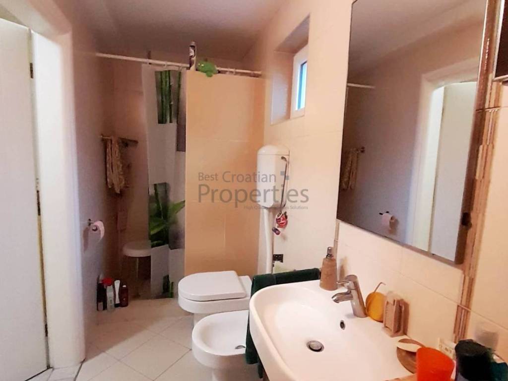 Stan na katu je dvoetažni - u prizemlju je jedna velika soba i kotlovnica koja se može urediti kao kupaonica a unutarnje stepenice vode na prvi kat gdje su tri spavaće sobe, veliki dnevni boravak, kuhinja s blagovaonicom, kupaonica i dvije terase od kojih jedna vodi u stražnje uređeno dvorište. U potkrovlju u koje se ulazi iz tog stana ima još prostora za proširenje.