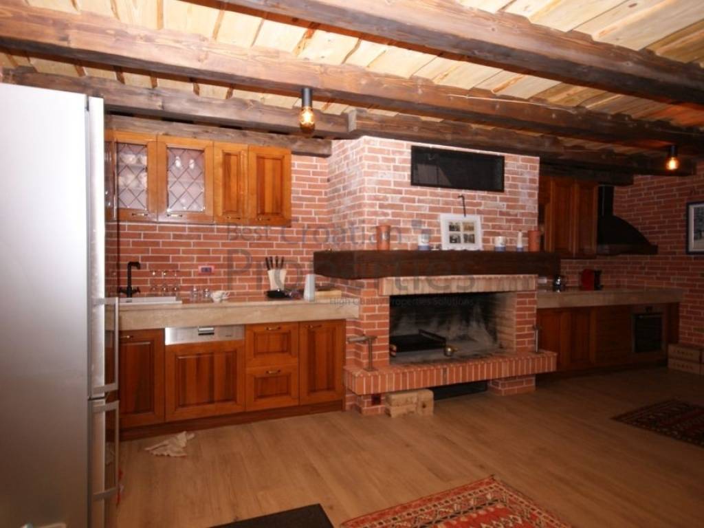 U prizemlju se nalazi predivan veliki dnevni boravak s otvorenim kaminom, blagovaonica, kuhinja i gostinjski sanitarni čvor.