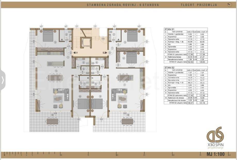Apartment S2 is located on the ground floor of the building and contains:hallway with wardrobe, kitchen, dining room and living room with access to a covered terrace with a beautiful view of the sea, three bedrooms, two bathrooms, one toilet, storage room and uncovered terrace, total square footage 131.18 m2.The apartment also includes: a storage room, a garden, a swimming pool and two parking spaces in a garage with an elevator.