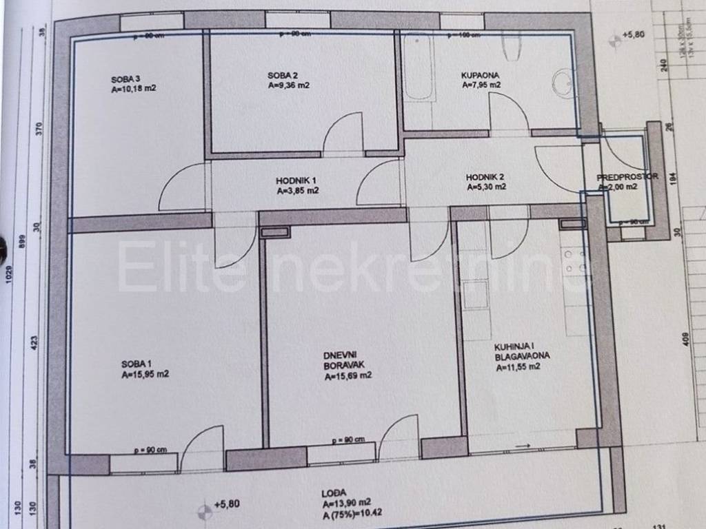 The apartment is located on the first floor with a separate entrance and consists of an entrance hall, two corridors, a bathroom, three bedrooms, a living room, a kitchen with a dining room and a loggia, with a total area of 95.73 m2.