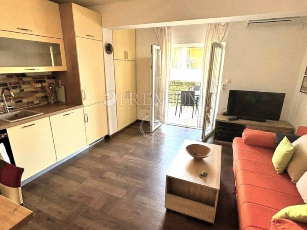 Apartment for sale in Njivice on the first floor of a residential building, in one of the most sought-after locations on the island of Krk. The apartment has a total area of 53 m² and consists of a bedroom with access to a terrace overlooking greenery, a bathroom, a kitchen with a dining area, and a living room that leads to a spacious covered terrace.