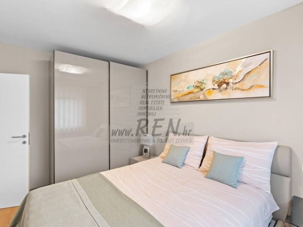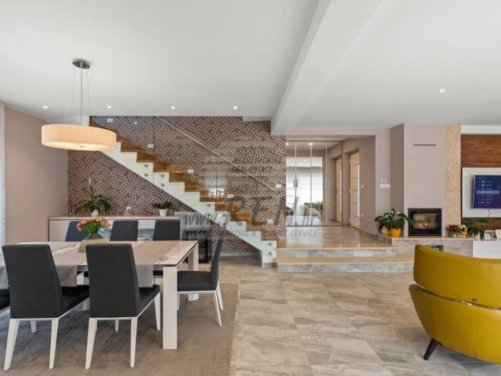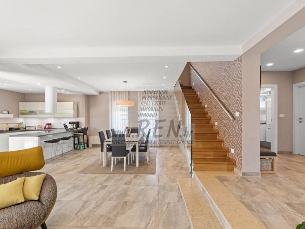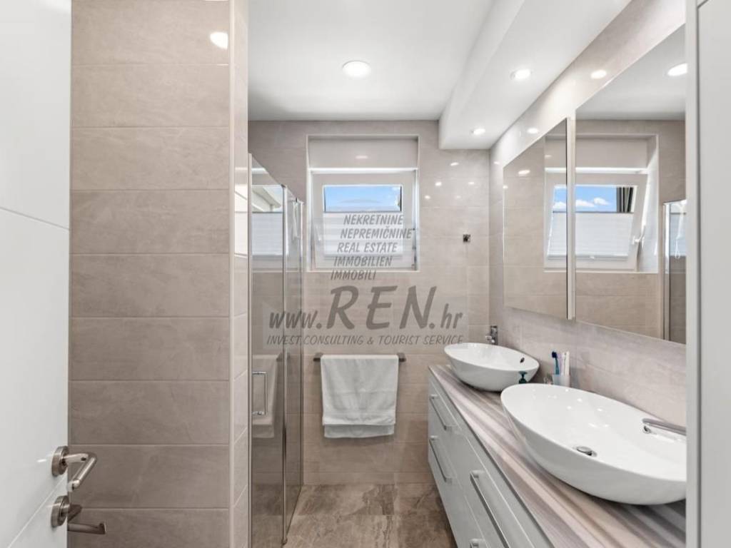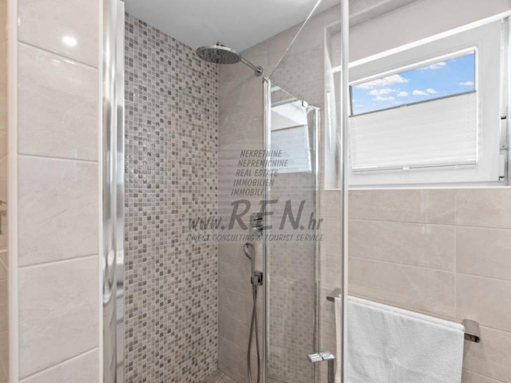The spacious 302 m² house is intelligently divided into two completely separate units, making it ideal for larger families, investors, or those seeking a combination of private residence and rental potential. The main unit features a spacious living room opening onto the terrace and garden, modern kitchen, bedrooms and bathrooms, while the ground floor also includes a practical garage. The second unit, with an entrance on the upper floor, charms with its open-concept living area extending to the kitchen and dining room, leading to an intimate bedroom. The true gem of this unit is the staircase leading to the rooftop terrace where a jacuzzi with panoramic sea views awaits - the perfect spot for romantic sunsets or evening relaxation to the sound of waves.