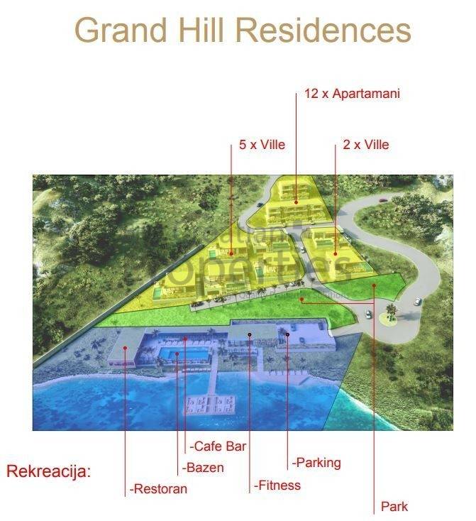 Položeno je neposredno uz morsku obalu, a smještajne vile pažljivo su raspoređene po padinigornjeg dijela parcele. Obalna prometnica je također u neposrednoj blizini što omogućuje jednostavan dolazak na lokaciju.