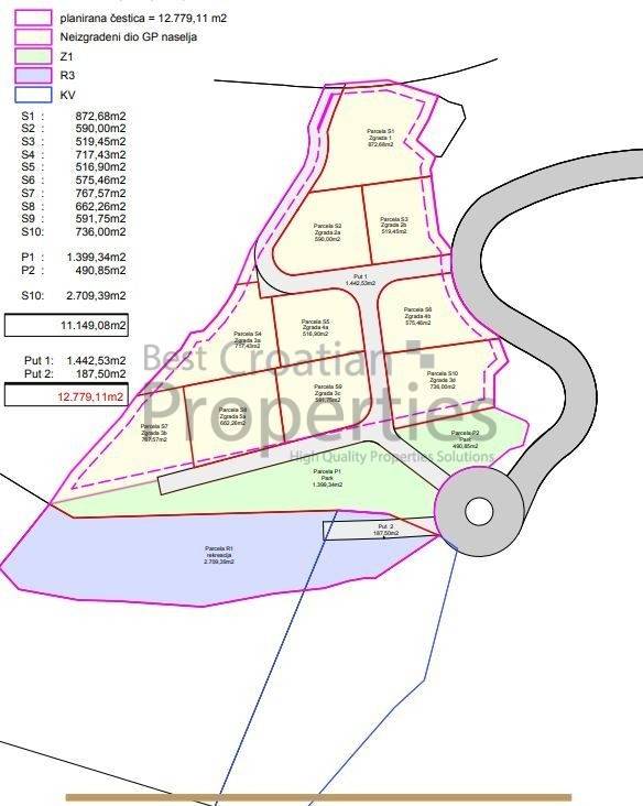 Radi se o građevinskom zemljištu s izrađenim projektom ukupne površine12 779,11 m2. Nalazi se na mirnoj lokaciji koju krase sve ljepote mediteranskog krajolika.