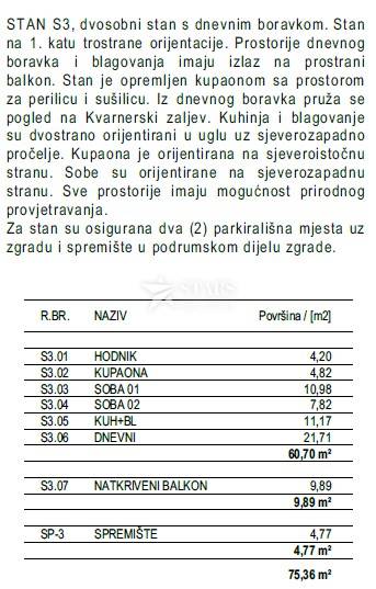 For sale is a two-bedroom apartment with a living room (S3), located on the first floor of a modern residential building(B) in a peaceful area of Kosi, surrounded by greenery, offering a beautiful view of the Kvarner Bay.