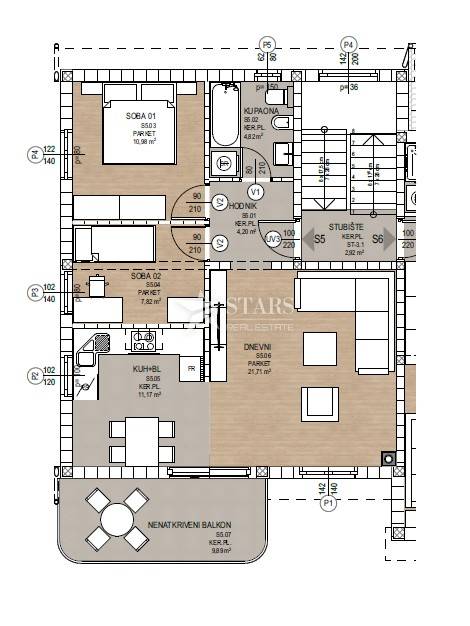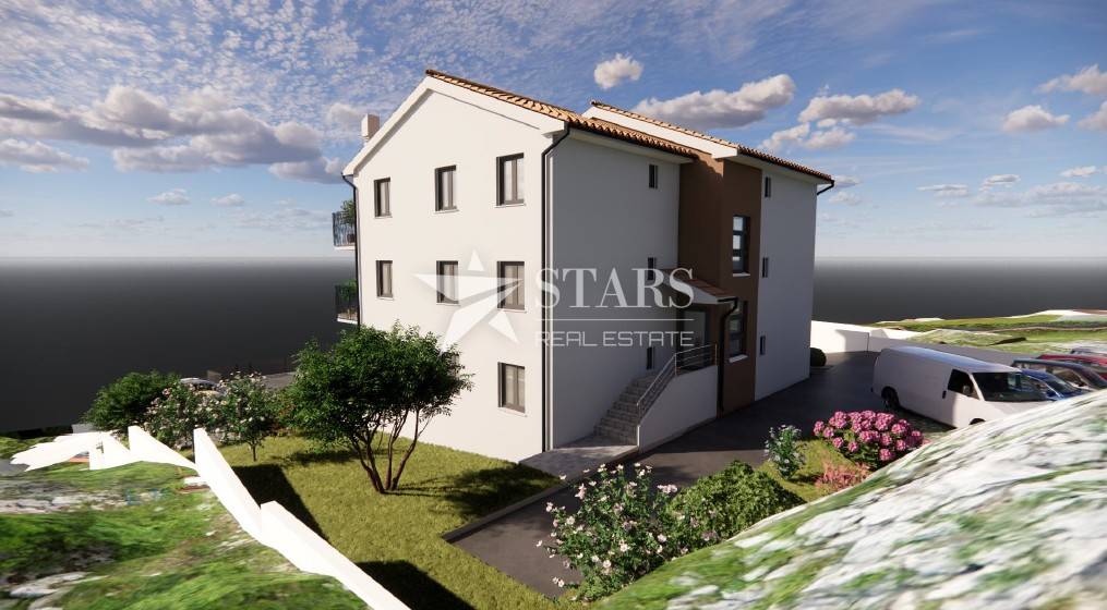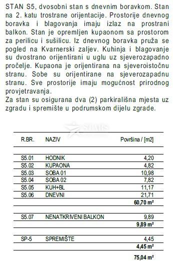 For sale is a two-bedroom apartment with a living room (S5), located on the first floor of a modern residential building(A)in a peaceful area of Kosi, surrounded by greenery, offering a beautiful view of the Kvarner Bay.