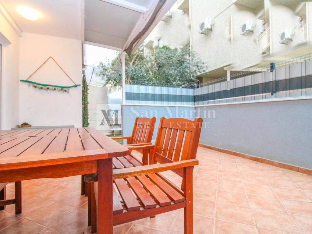 It consists of a living room with kitchen and dining area, a bedroom with its own terrace, a bathroom and a storage room.