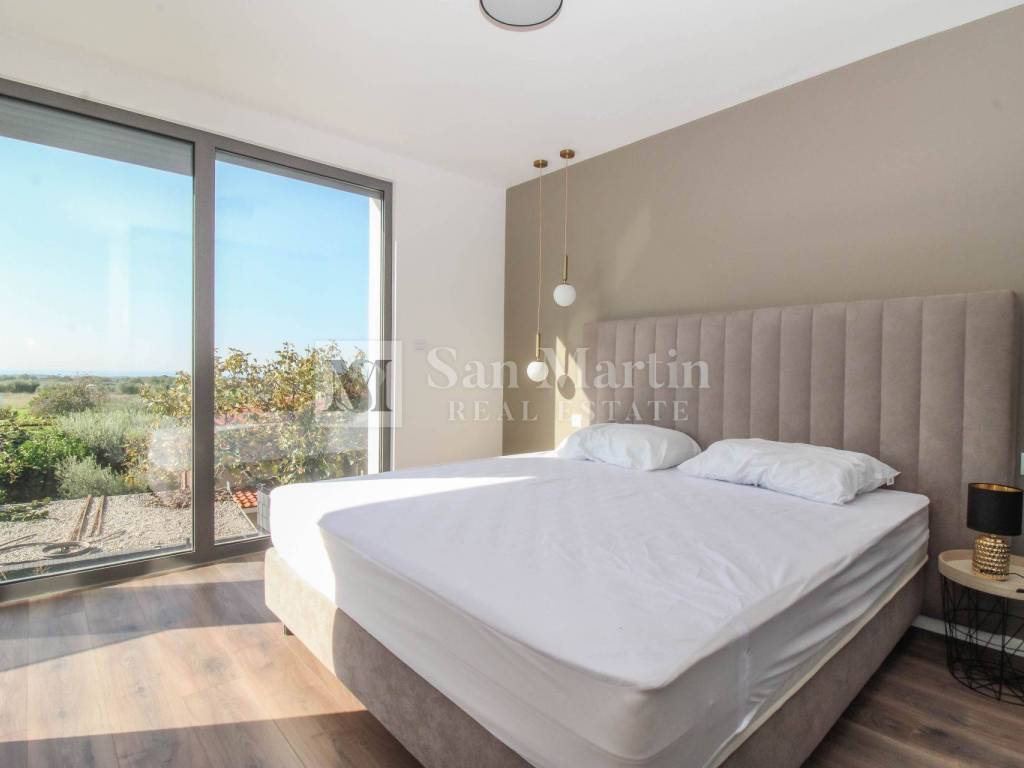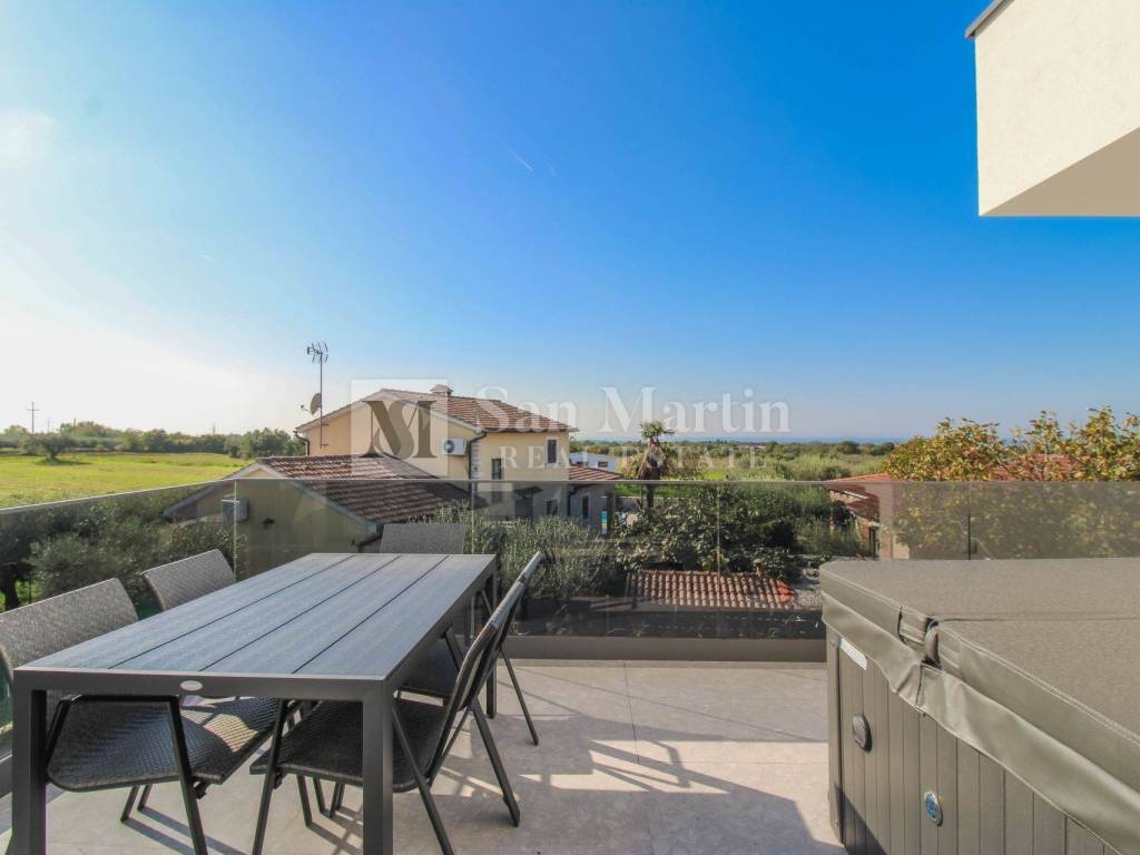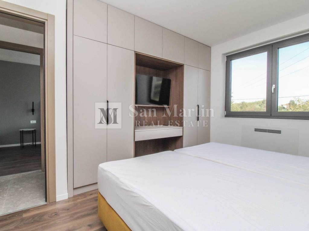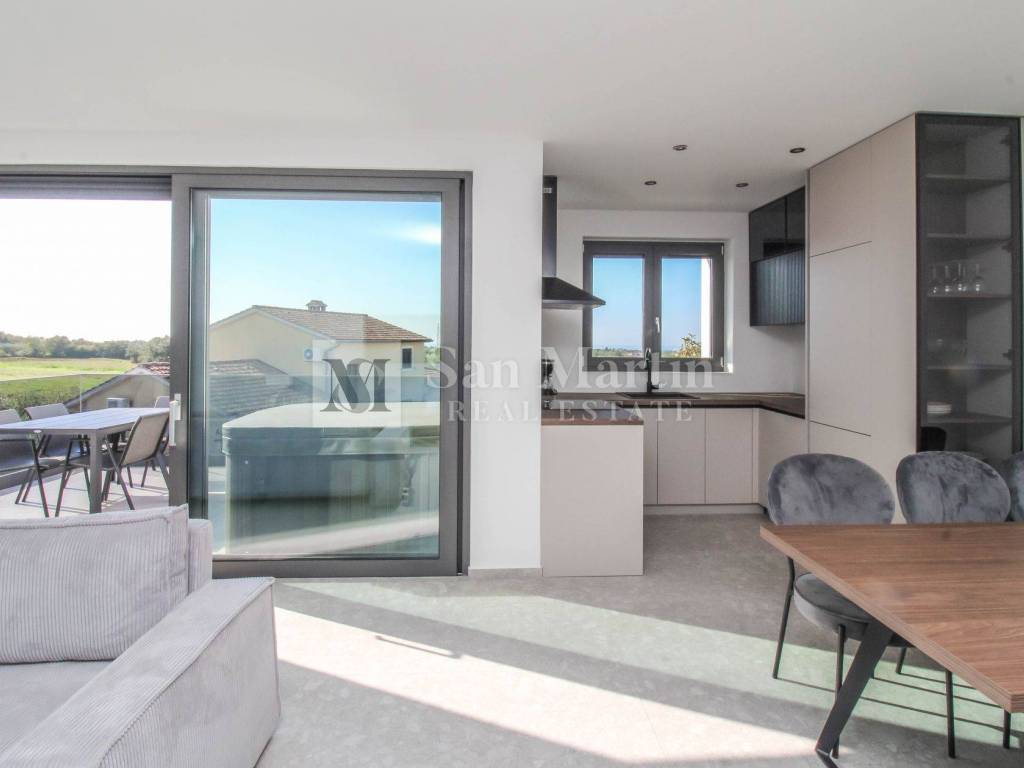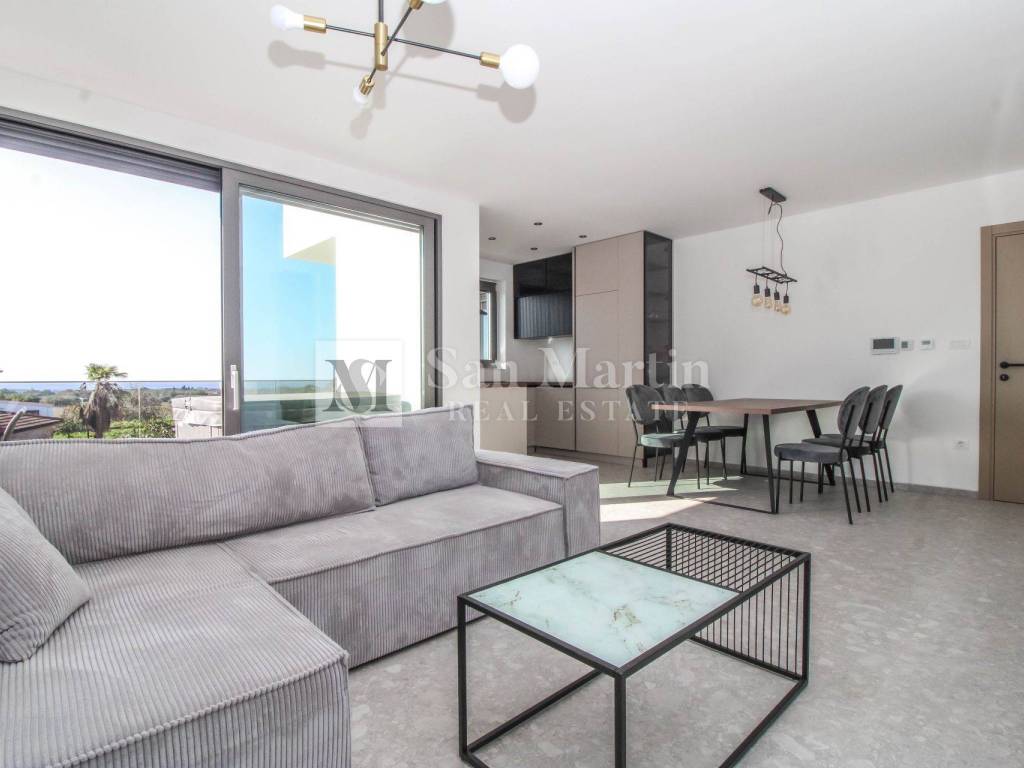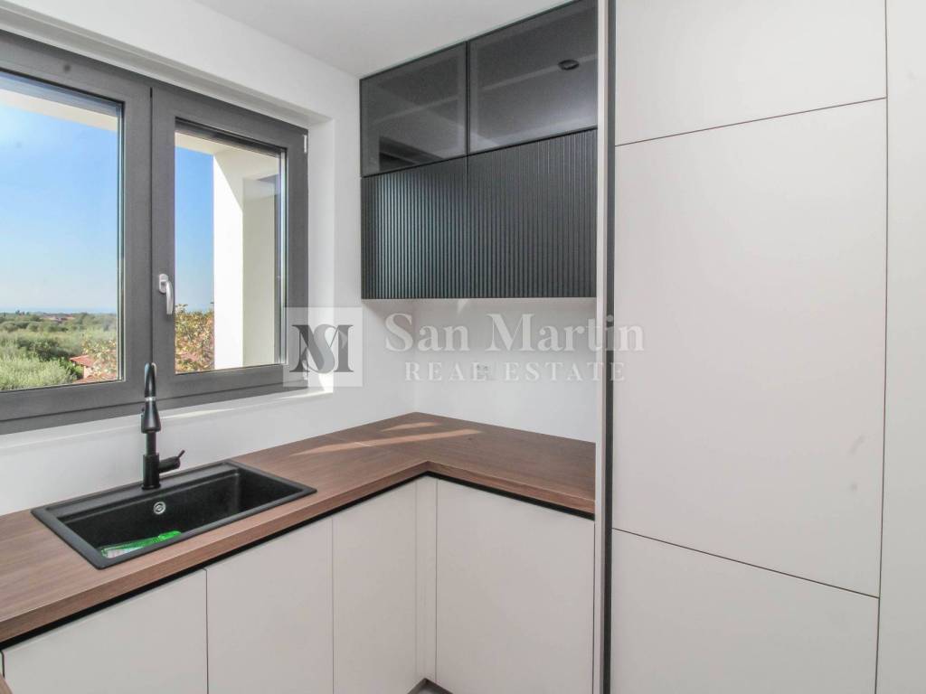 Near the city of Poreč and the sea, there is a modern apartment for sale in a new building with a beautiful view of the sea and rich contents.