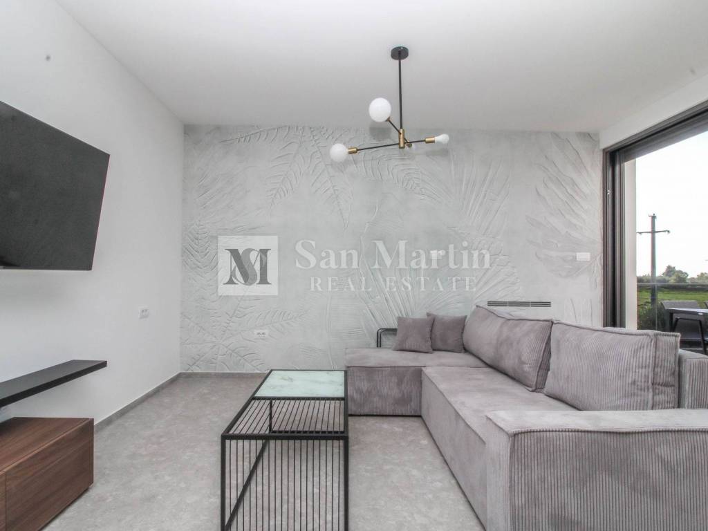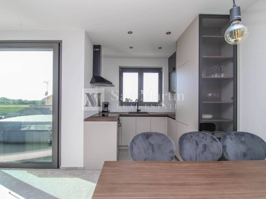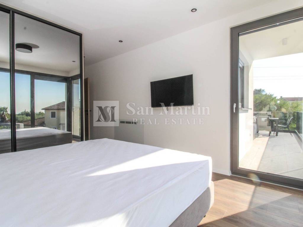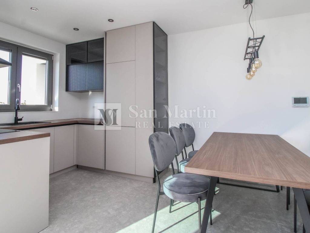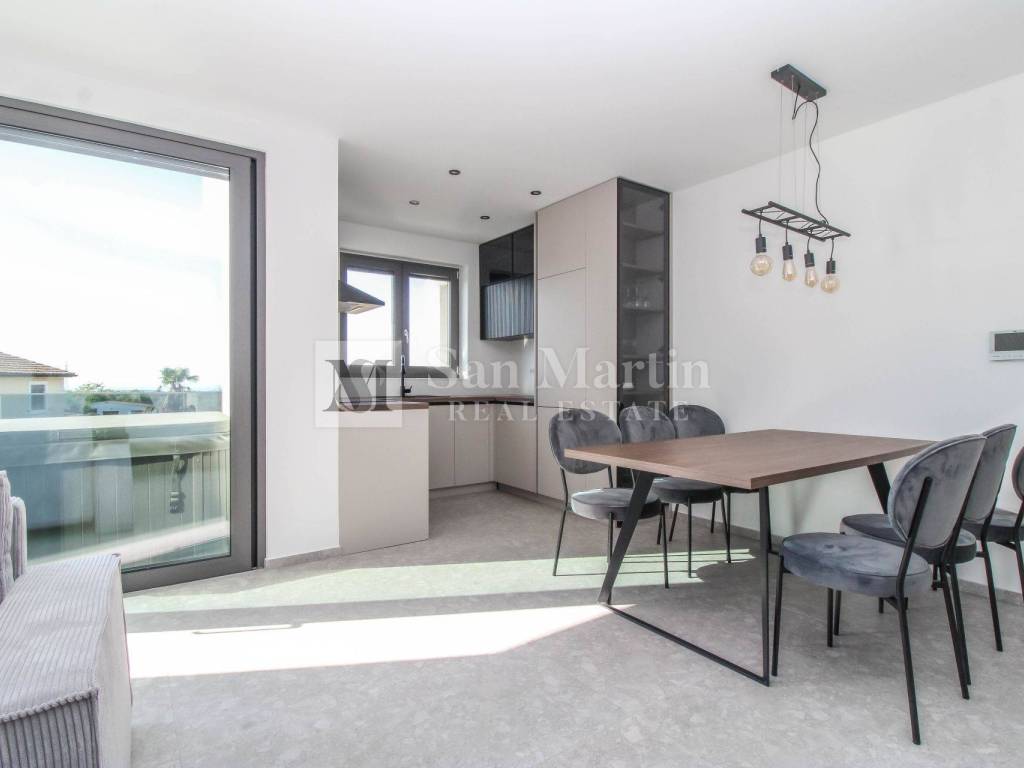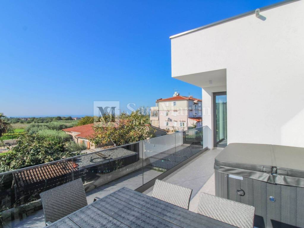 Near the city of Poreč and the sea, there is a modern apartment for sale in a new building with a beautiful view of the sea and rich contents.