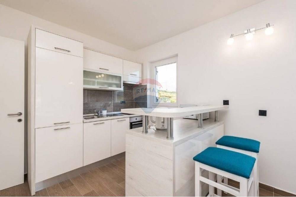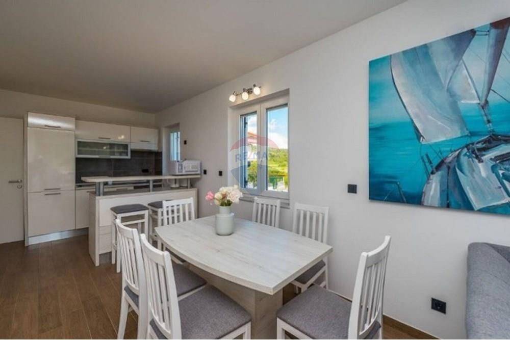 The interior of this modernly furnished apartment includes two spacious bedrooms, a modern bathroom, and an open concept kitchen with a dining room. The living area offers a beautiful, open view of the sea and the bay, ensuring a relaxing atmosphere and enjoyment of the Mediterranean climate.
