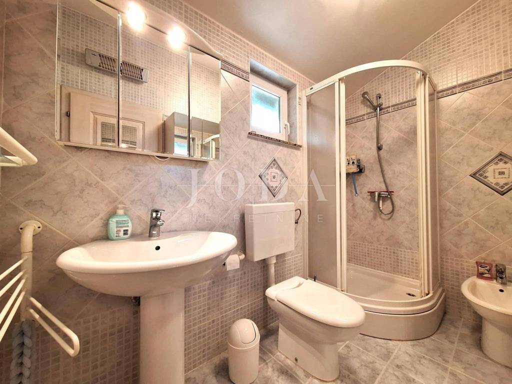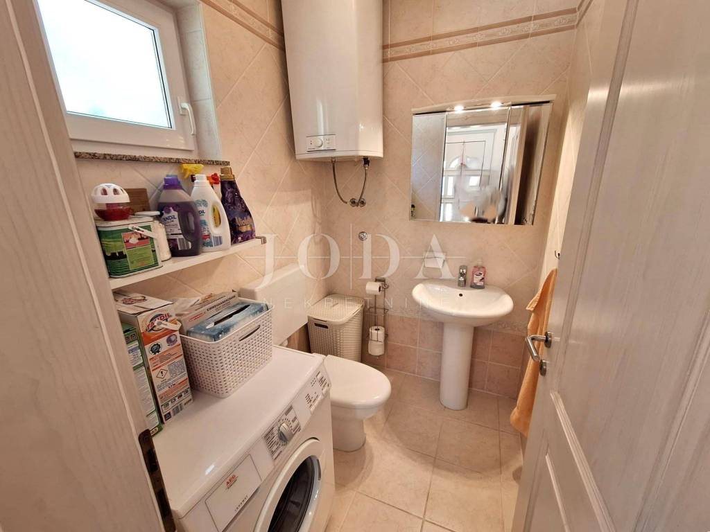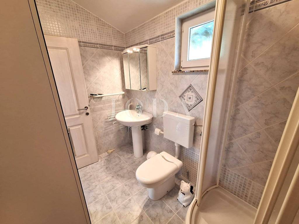 The house consists of a living room, kitchen and dining room, toilet, storage room, entrance hall and terrace, while on the first floor there are two bedrooms (one is currently arranged as a dressing room), hallway, bathroom and terrace with a sea view.