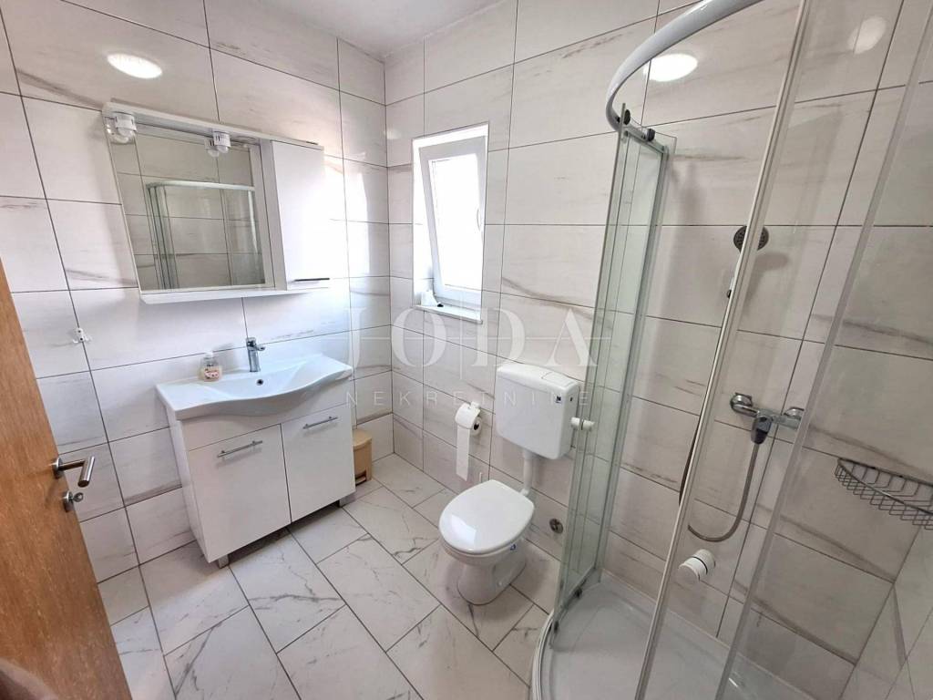 A two-storey apartment of 64.13 m2 with a 200 m2 garden with a swimming pool is for sale. The apartment consists of a ground floor and an upper floor. The ground floor has a living room with a kitchen and dining area, a toilet and a terrace. The upper floor has two bedrooms, a bathroom and a terrace. Air-conditioned, furnished. The neat garden has a swimming pool, barbecue and a garden house. Beautiful location 5 minutes drive from Malinska.