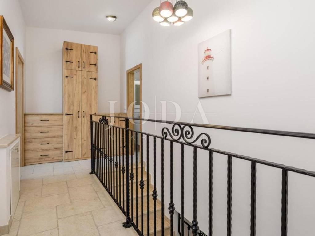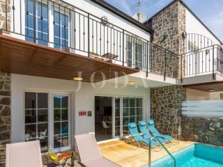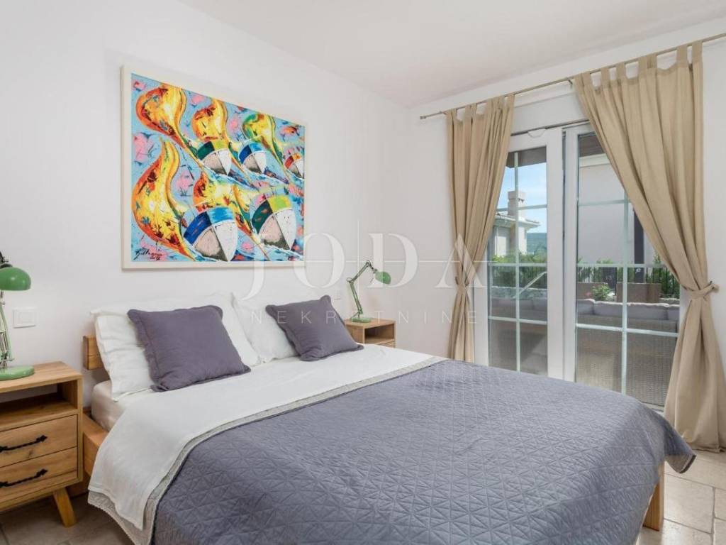 The villa consists of a ground floor and an upper floor where there is a living room with kitchen and dining room, three bedrooms, three bathrooms and a terrace. In front of the villa is a terrace with a sunbathing area and a swimming pool of 20 m2. The entire villa is equipped with underfloor heating and is air-conditioned (multisplit system). The heating and cooling system is connected to the heat pump. The villa has its own storage room and engine room located in the front part of the garden.