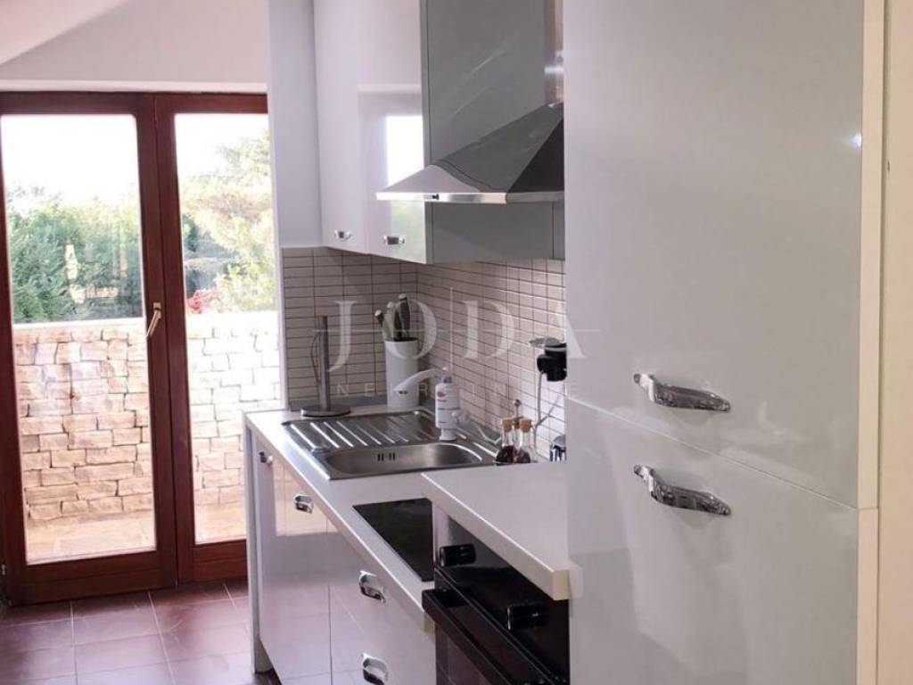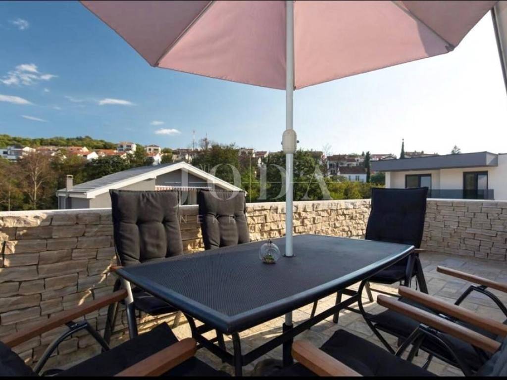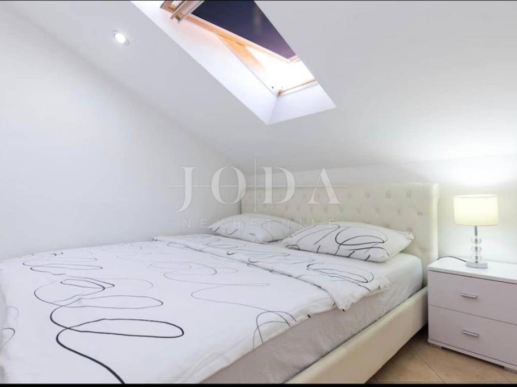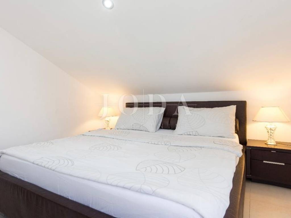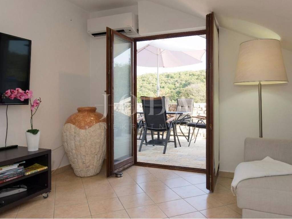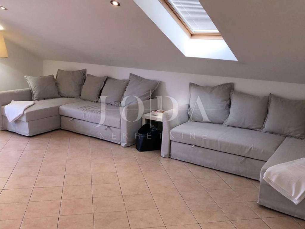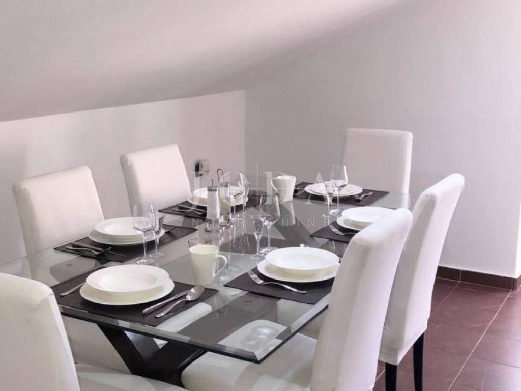 For sale is a beautifully decorated penthouse located in a quiet location in an apartment house, only 300 meters from the sea and the newly renovated waterfront in Njivice with one of the most beautiful promenades on the island of Krk. The entire part of the attic belongs to it, and it consists of three bedrooms with large double beds, a modern bathroom, a living room and an elegant high-gloss white kitchen with a dining room. Two large covered terraces offer a beautiful view of Opatija and the Kvarner Bay and are rustically decorated with Istrian Kanfanar stone. The apartment is luxuriously equipped and arranged for tourist rental and is sold fully furnished by agreement. It has a 44 m2 garden with a barbecue and two parking spaces. An excellent opportunity to purchase a beautiful property for tourist rental.