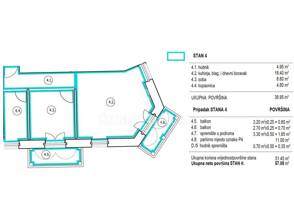 At your disposal are: hallway, living room with kitchen and dining room, bathroom and bedroom (total area 36.95 m), two balconies with an area of 5.90 m, and a storage room and corridor in the basement with a total area of 4 m.