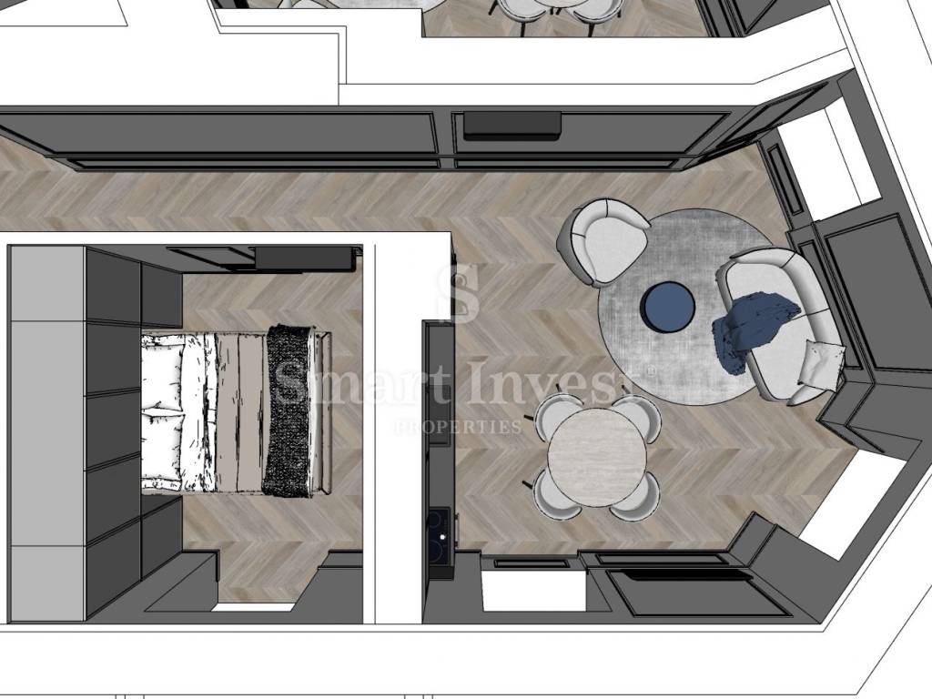 Apartment number 4, with a total area of 57.85 m2, fully equipped with designer furniture, is located on the 2nd floor of the villa with an elevator.